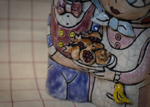 Ci sono infine le faccine in ceramica raku, una diversa dall’altra, che indossano in testa fazzoletti colorati.