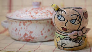 Attraverso tratti essenziali tipici dello stile grafico della bottega, queste Pupe diventano manufatti in ceramica smaltata. Vasi a forma di donna sono l’oggetto di punta della collezione realizzati interamente a mano senza uso di stampi, sono dei pezzi unici.