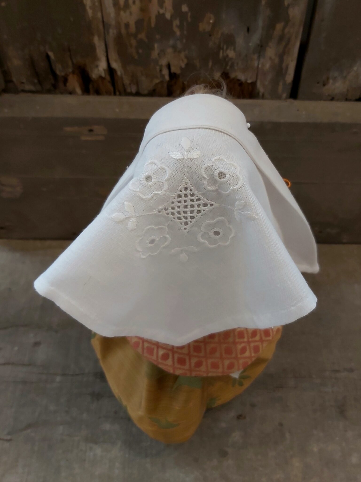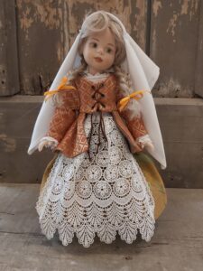La mini bambola indossa gli abiti della festa di una contadinella marchigiana di fine ‘700. Tutto ovviamente è stato riprodotto basandosi su stampe d’epoca grazie al libro del Professor Sergio Anselmi, un vero “vangelo” per quello che riguarda la storia e la tradizione locale.