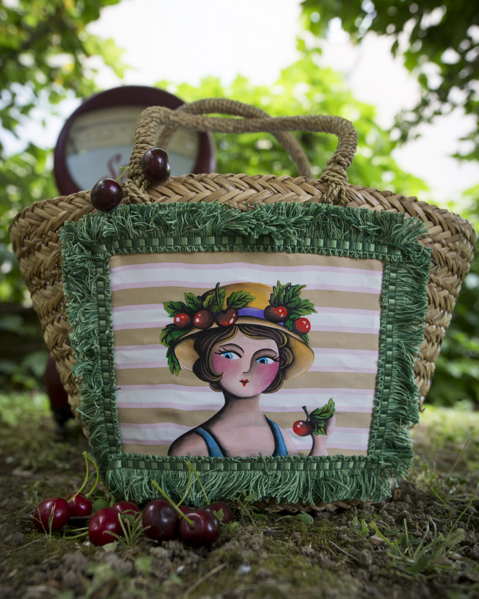 Borsa grande in paglia con cappello e ciliegie