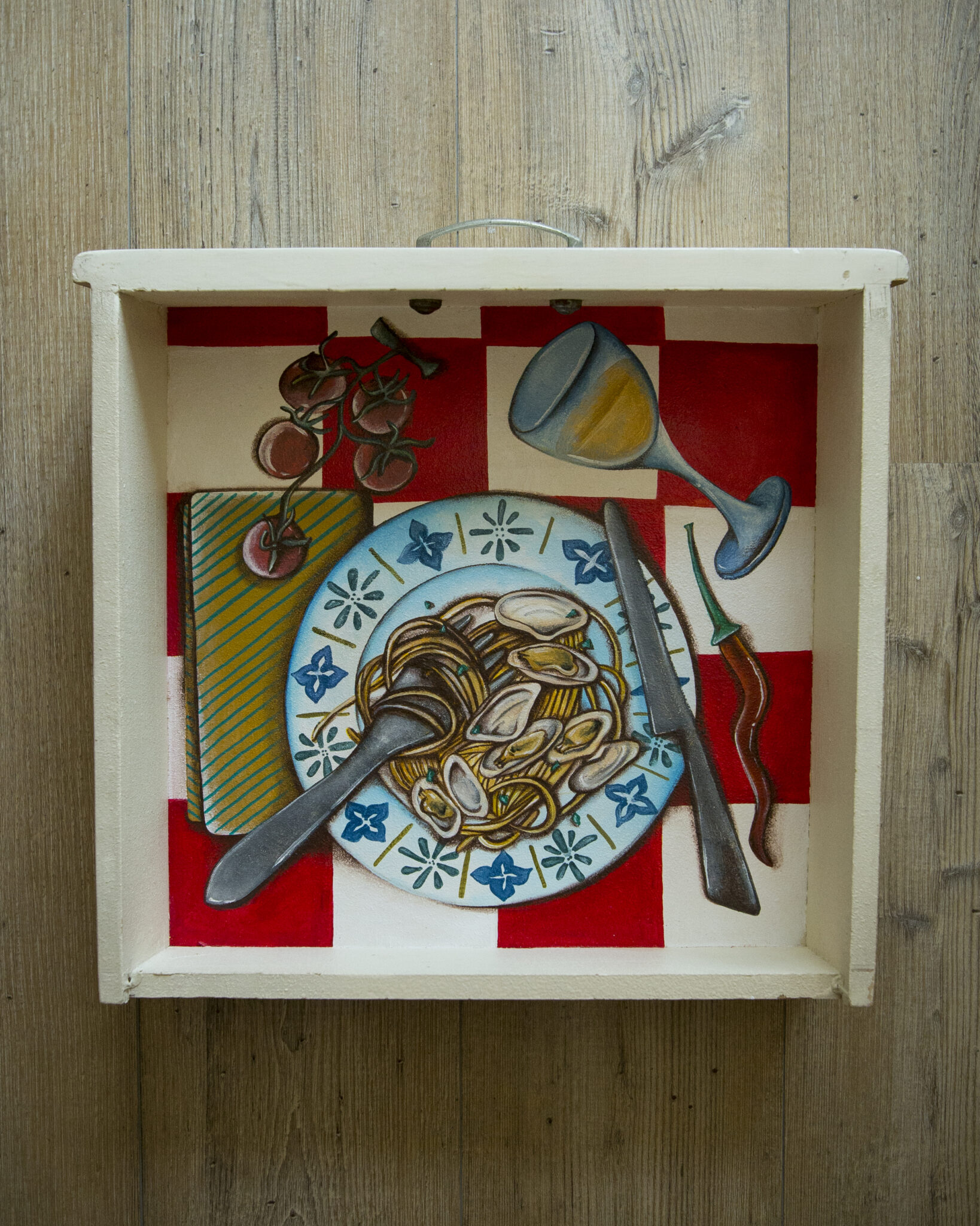 Dipinti acrilico su fondi riciclati: cassetti, porte o sportelli trasformati in cornici d’autore, su cui emergono colori e texture che raccontano storie di recupero e rinascita.
