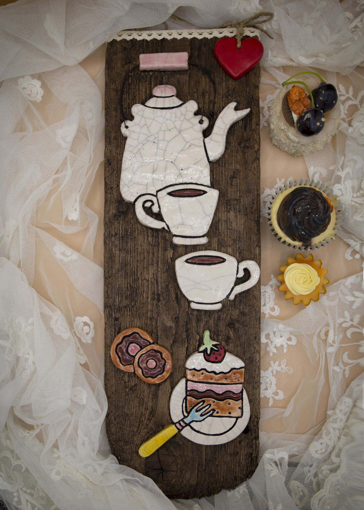 Silhouette in ceramica raku: animali, teiere, e casette che messe una di seguito all’altra, formano un vero e proprio villaggio. Applicate su vecchie tavole di recupero, completiamo l’opera con piccoli accessori vintage come pizzi, chiavi e ferramenta, per un effetto collage ricco di memoria.