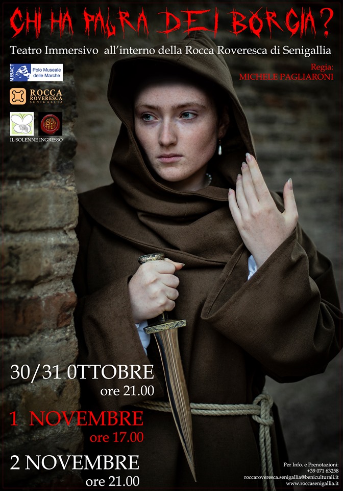 Dal 30 ottobre al 2 novembre il Polo Museale delle Marche e la nostra Associazione culturale “L’Estetica dell’Effimero” organizzano insieme un nuovo grande evento: “Chi ha paura dei Borgia?”. La Rocca Roveresca di Senigallia si aprirà al pubblico diventando la scena ideale di una misteriosa e coinvolgente esperienza di teatro immersivo, una sorta di “halloween storico” che prenderà le mosse dai sanguinosi fatti passati alla storia sotto il nome di “Strage di Senigallia”, una delle più clamorose manifestazioni del cinismo e dell’efferata crudeltà di Cesare Borgia, figlio di Alessandro VI.