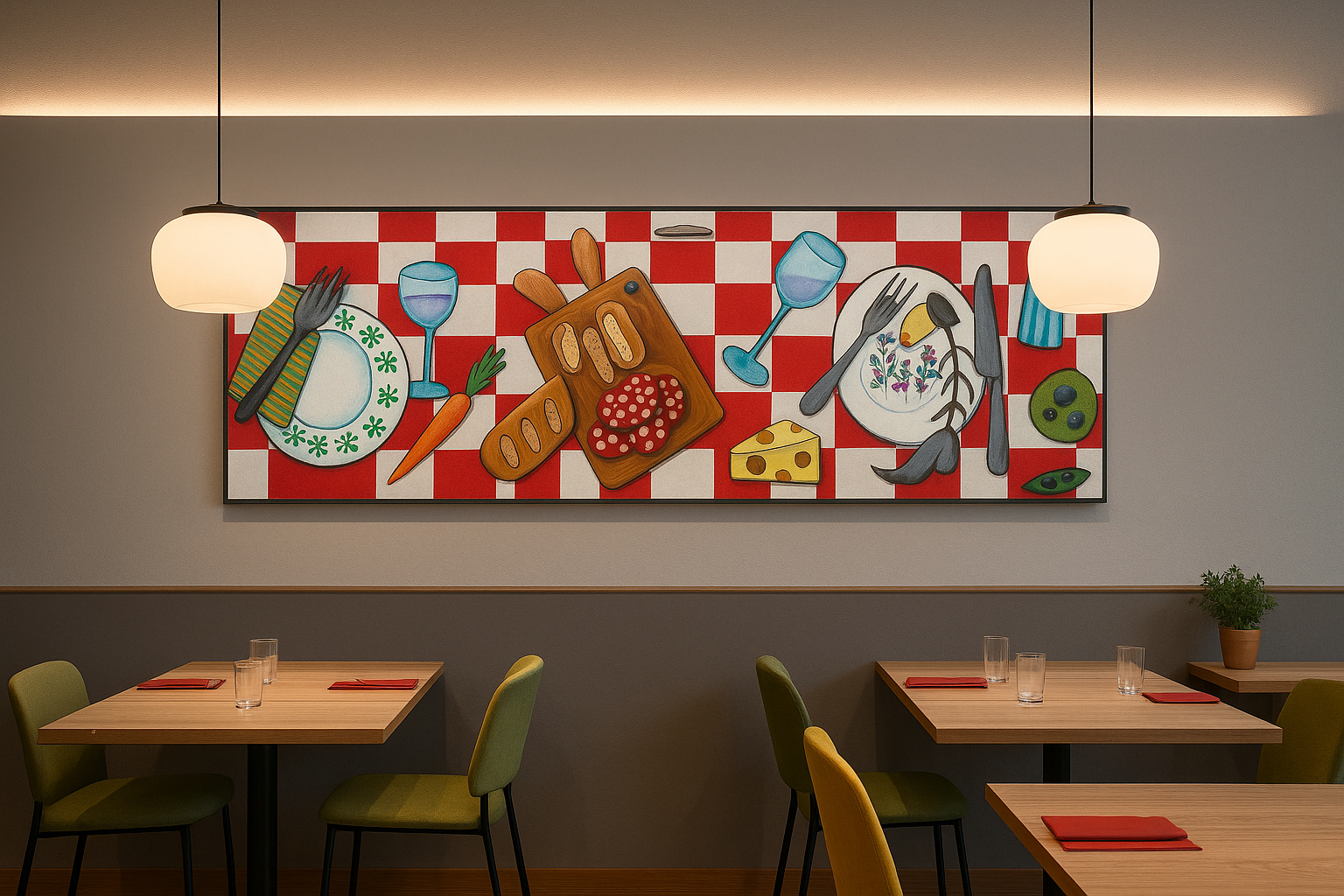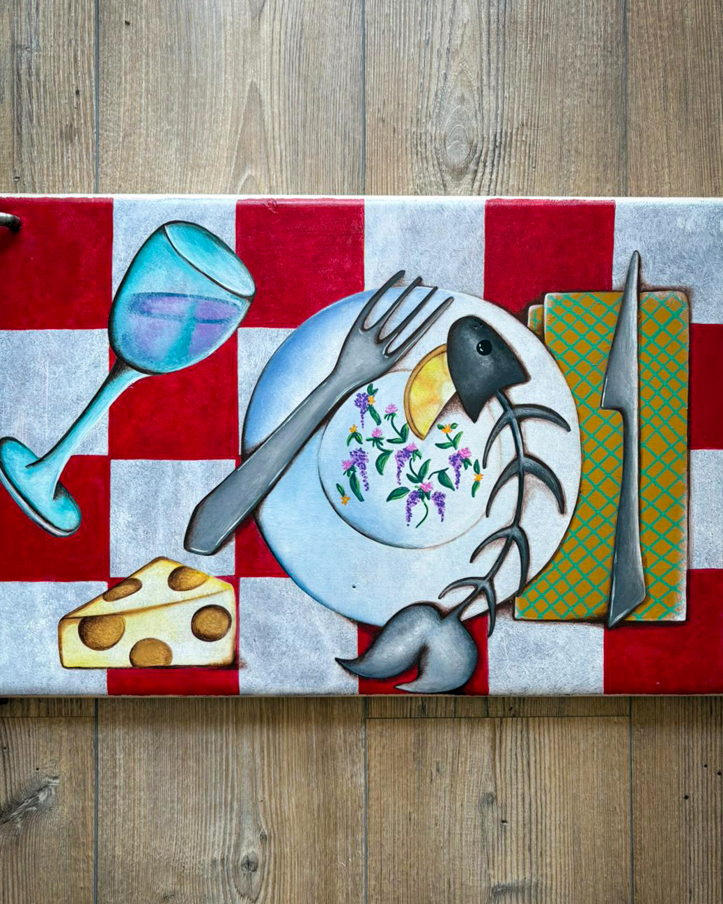 Uno sportello trasformato in quadro da cucina: la base a scacchi rossa e bianca richiama una tovaglia da osteria. La scena, dipinta a mano in stile naif, raffigura piatti, bicchieri e cibi visti dall’alto, come se si stesse gustando una tavolata conviviale.