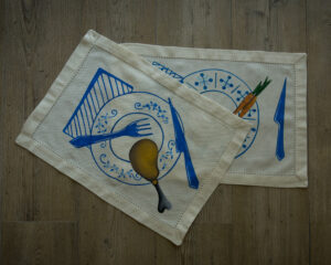 Da utilizzare invece tutti i giorni nella vita quotidiana, le tovagliette all’americana. Quattro tessuti rettangolari in cotone con bordo ricamato a giorno, dipinti con colori per stoffa in toni di blu. Ogni tovaglietta mostra piatti e posate, completando la tavola immaginaria. Ogni pezzo è unico e personalizzato con una pietanza colorata in base alle preferenze culinarie, per soddisfare gusti diversi. C’è infatti il trancio di pizza, la lisca di pesce, la coscia di pollo e due carotine, pensate sia per chi è a dieta, sia per chi segue preferenze vegetariane.