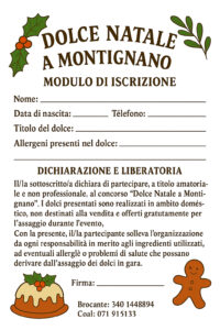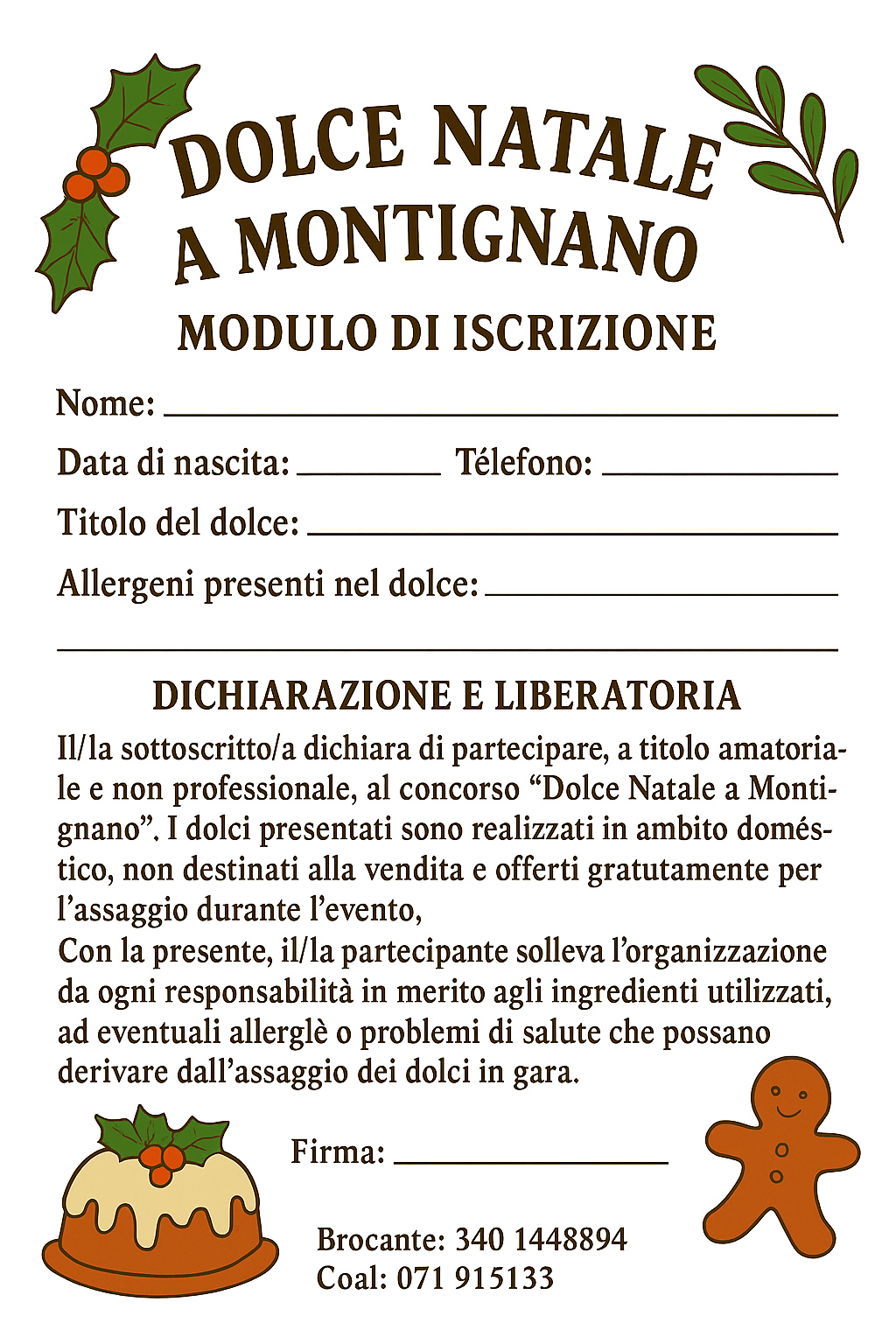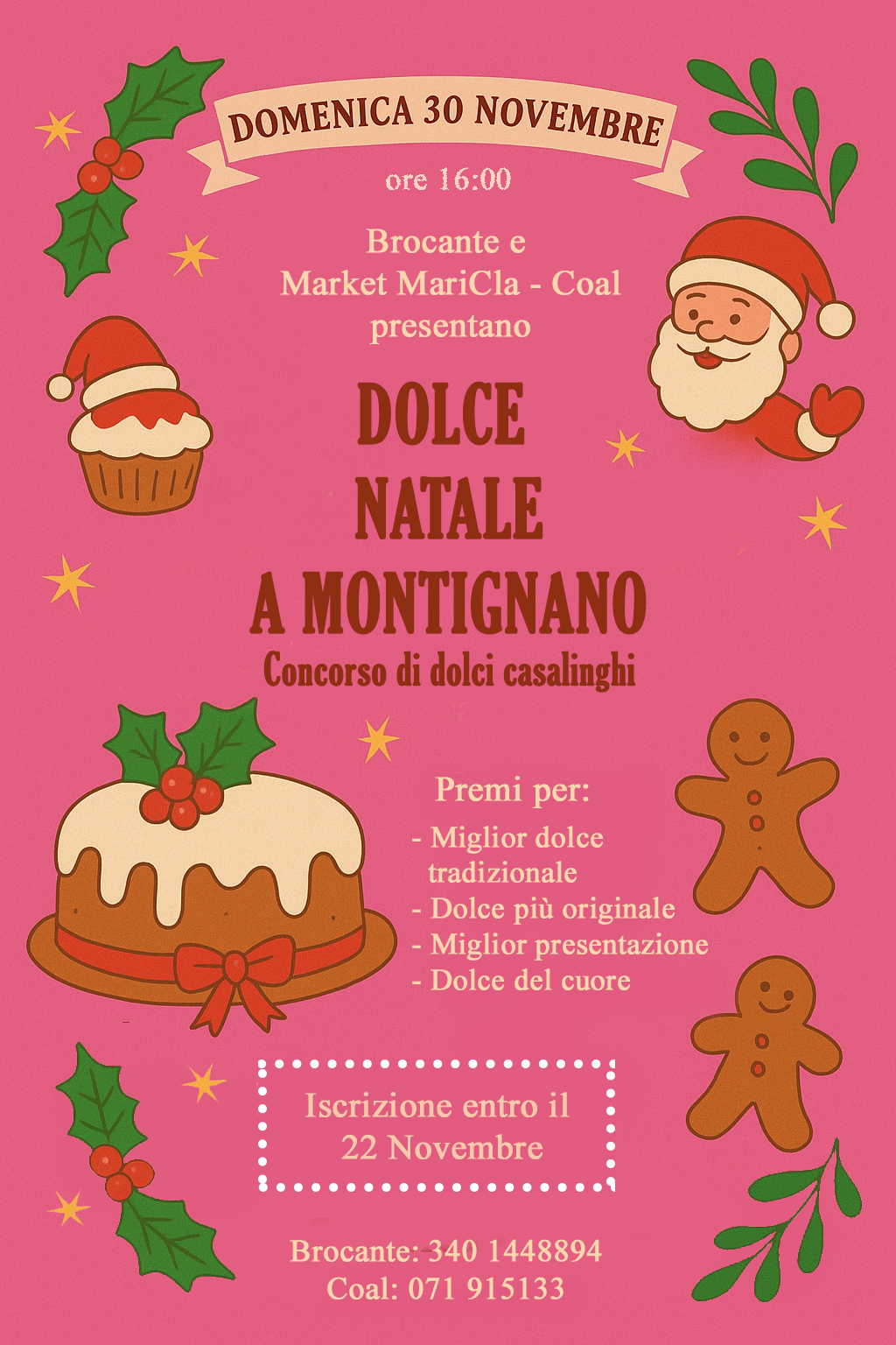 Il Laboratorio artistico Brocante e il Market MariCla – Coal organizzano il concorso di dolci casalinghi “Dolce Natale a Montignano”, un appuntamento pensato per riscoprire la gioia delle tradizioni, la creatività in cucina e lo spirito di comunità che rende speciale questo periodo dell’anno.