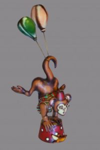 Dalle forme plastiche ai limiti del surreale, dall’enorme peso e altezza, in bilico su di una piccola palla, è controbilanciata da un leggero palloncino sospeso da un esile e precario filo.