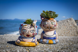 Due vasi antropomorfi sono l’inizio di questa nuova collezione. Realizzati interamente a mano senza uso di stampi. La particolarità questa volta è che alla base, si trova un piccolo piedistallo a forma di salvagente. Questo perchè i nostri bagnanti non sono ancora molto pratici nell’acqua.