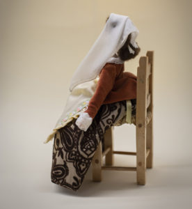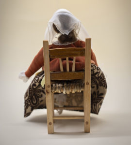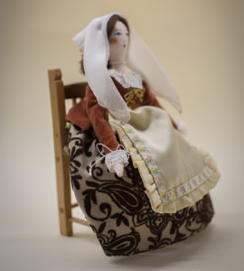 Così guardando la seggiolina, di stile rustico e campagnolo, abbiamo pensato di prendere spunto dalla tradizione contadina marchigiana. La mini bambola avrebbe dunque indossato gli abiti della festa di una contadinella di fine ‘700. Ovviamente prima ci siamo documentati attraverso delle stampe d’epoca, le stesse che Lorenzo ha consultato per il suo ultimo costume di Carnevale “Le Pupe del Biroccio”.