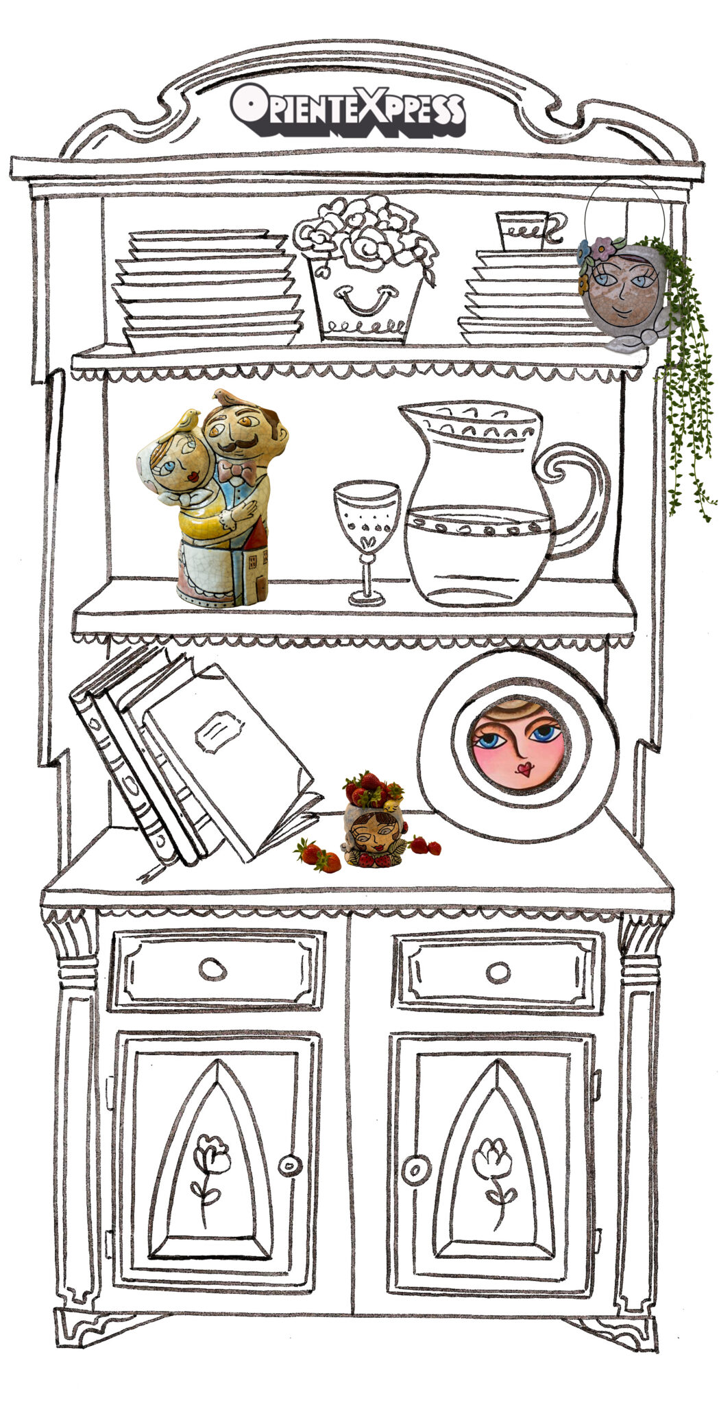 Sull’altro fianco un’altra credenzina è arricchita da elementi della collezione de Le Pupe del Biroccio.