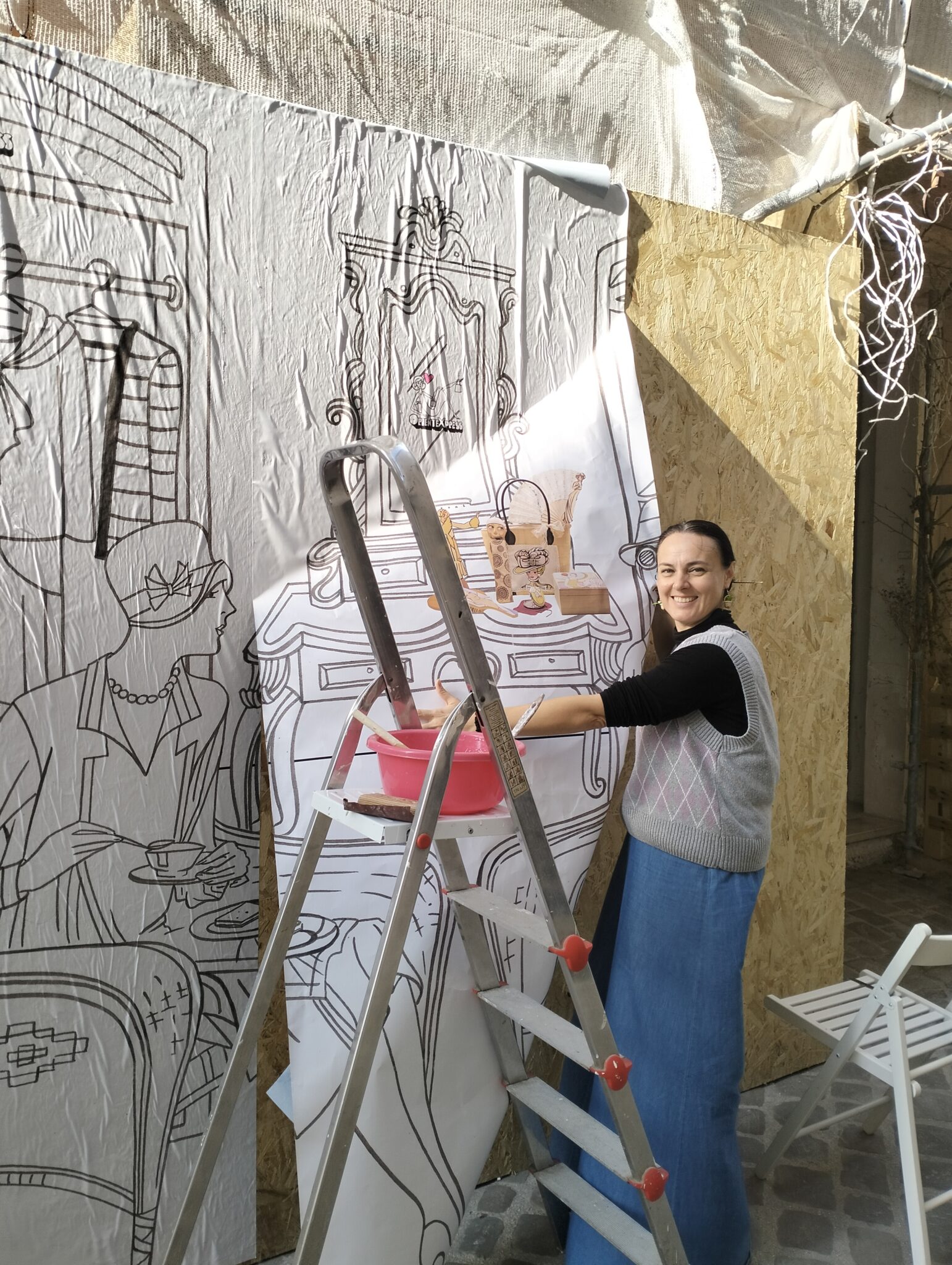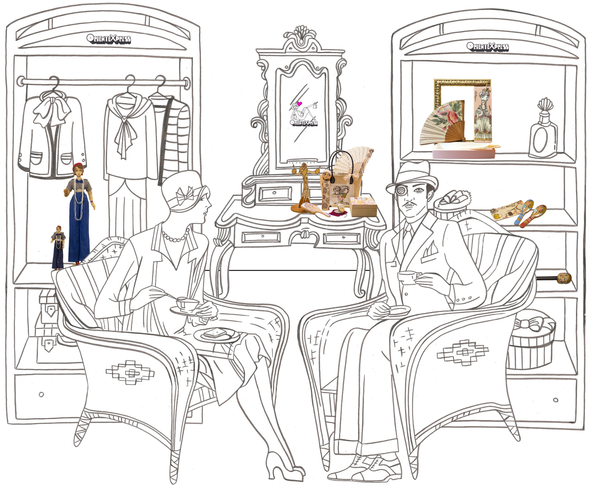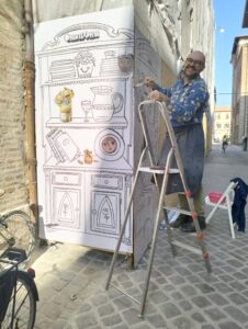 L’idea è arrivata dai nostri bozzetti. Grazie alla computer grafica sono stati perfezionati e adattati alla grandezza di una maxi affissione. Una donna e un uomo in stile 1920 sorseggiano elegantemente una tazza di thè. Sullo sfondo scansie colme di oggetti disegnati, ai quali si alternano fotografie ritagliate di opere presenti in bottega.