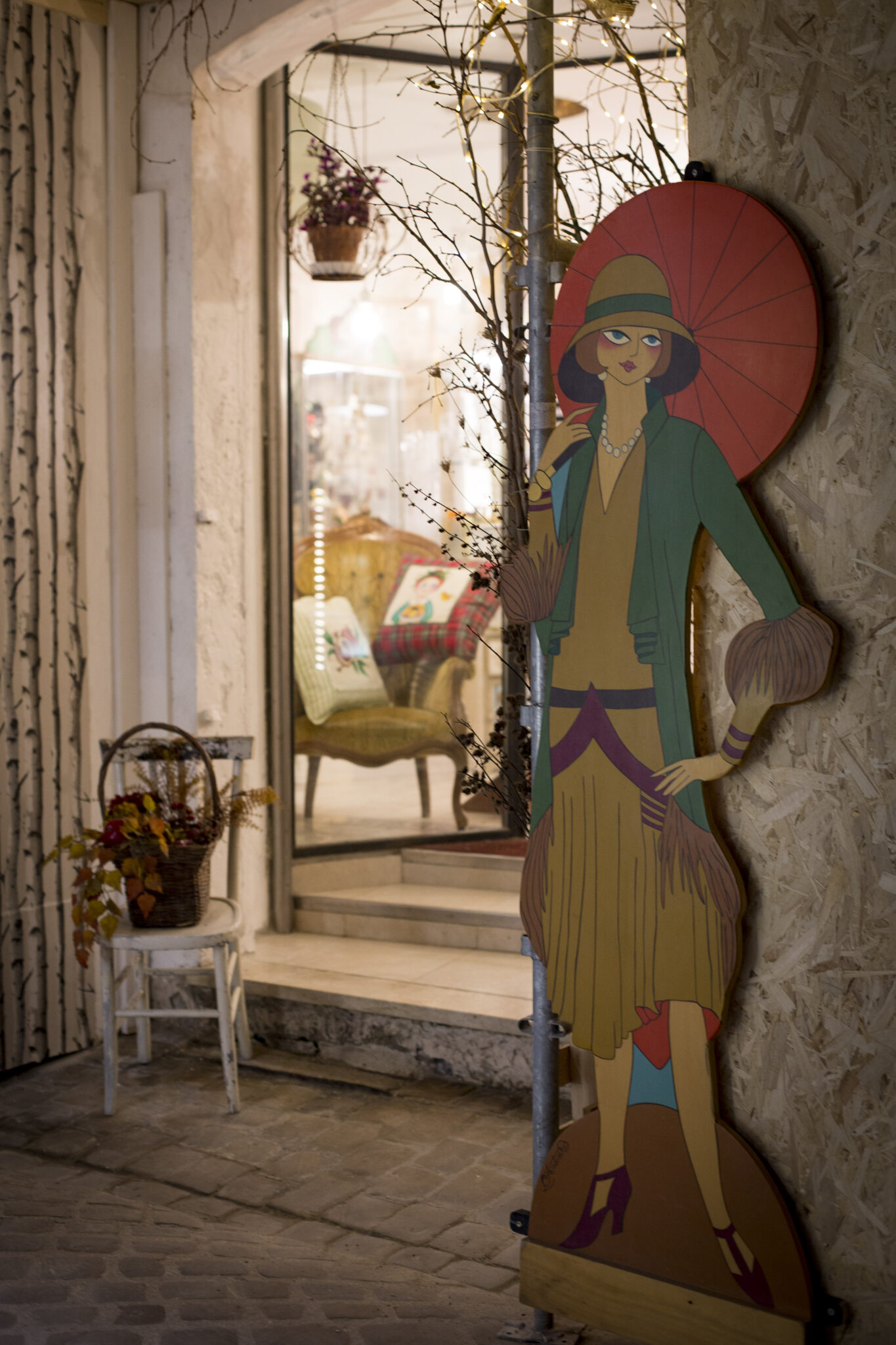 La cassetta della posta caratteristica dell’Orientexpress, è momentaneamente affissa al tronco di un albero di betulla. Uno dei tanti che corrono paralleli sulla carta da parati all’altro lato della struttura. Poi c’è una seggiolina di recupero con un cesto pieno di primizie di stagione e appesa una teiera in ferro battuto dalla quale sbucano foglie di color viola.