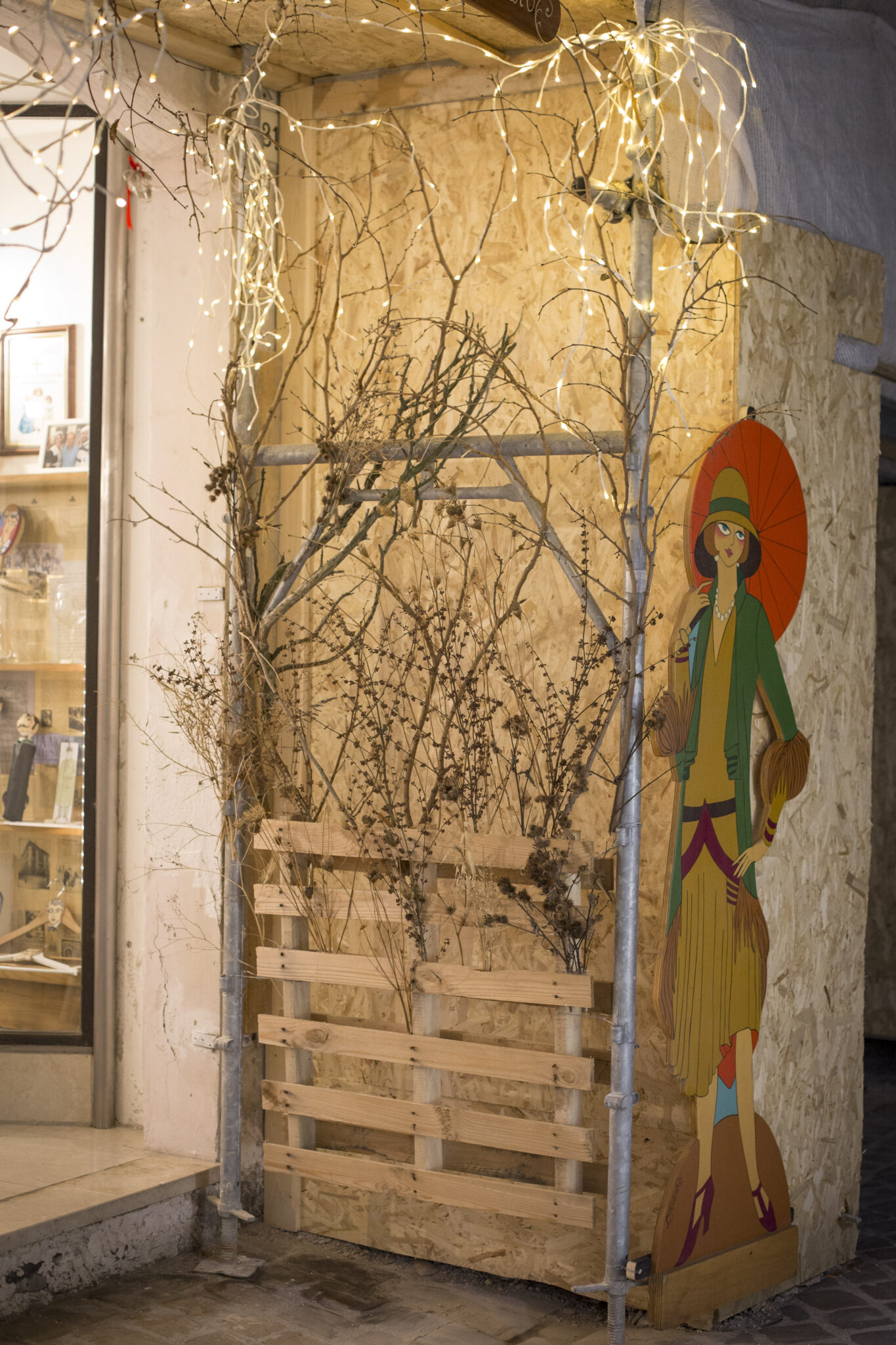 Con un po’ di fantasia è stato trasformato in una veranda che richiama la natura in autunno. Un bancale come recinto da cui spuntano piante secche raccolte ai bordi delle strade di campagna. Anche il soffitto è pieno di rami nudi intrecciati con lucette dorate.