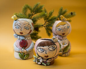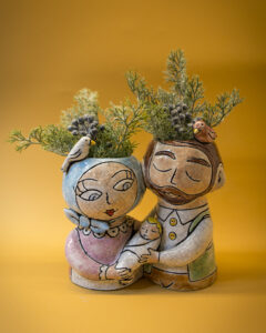 Per Natale proponiamo così una nuova collezione formata da vasi antropomorfi di piccola e media dimensione, lampade da appoggio e per la prima volta, scatole e cornici in cui il legno si accosta alla ceramica raku, il materiale con cui sono fatte le nostre Pupe. C’è anche un’opera che strizza l’occhio al Presepe. Un doppio vaso in cui una coppia d’innamorati si abbraccia mentre tiene stretto un neonato. Visitando la sezione shop del sito alla voce Raku, potrete vedere tutte le nuove creazioni.