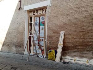 I proprietari però si sono presi del tempo perchè per una cosa così importante era necessario ragionare fino a trovare la soluzione ottimale. L’idea è venuta guardando come al solito al passato, alle vecchie insegne tipiche delle botteghe del centro storico. Due scritte in stile liberty ora ci dicono che in via Maierini si trova sia un Museo che un Teatro. Sempre in legno dipinto le cornici che valorizzano la vetrina principale. Una curiosità solo per pochi intenditori, è che due delle mascherine rappresentate, hanno gli occhi traforati per consentire all’avventore, di sbirciare al suo interno.