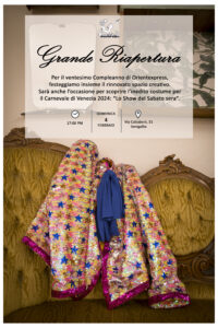 L’appuntamento sarà Domenica 4 Febbraio alle ore 17:00 e con l’occasione verrà presentata anche la nuova creazione per l’imminente Carnevale di Venezia ormai alle porte. Il tanto impegno per il lavoro di ristrutturazione, ha portato per quest’anno alla realizzazione di un solo abito da presentare in Laguna e sarà un omaggio ai 100 anni della radio e ai 70 dalla prima trasmissione televisiva. Il costume punta a raccontare il lato più effimero della TV: lo Show del sabato sera.