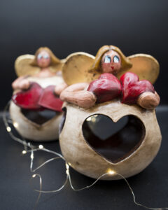 Novità sono le cartoline artistiche in terracotta. Sfoglie rettangolari anch’esse dorate, i classici angeli dipinti e sul retro, l’impostazione tradizionale per scrivere con l’indelebile l’indirizzo, la dedica e in ultimo, il francobollo. Come packaging le buste da spedizione per amplificare l’effetto postale.