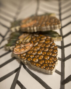 C’è poi un altro nuovo esperimento. Un’opera dipinta e una decorazione allo stesso momento. Arrivano le ghirlande in legno dipinte a mano.