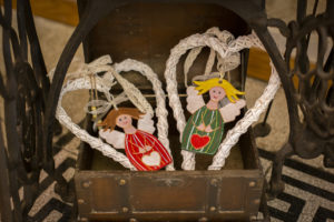 C’è anche la ghirlanda. A forma di cuore, in vimini bianco, con al centro ben in evidenza, la silhouette dell’angelo, questa volta in ceramica.