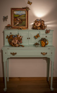 C’è poi una serie di tre tazze una da caffè, una da thè e una mug. L’idea trae origine dal fascino che Anna trova nello stile Brocante. Utilizzare cioè materiali di recupero, vintage, e ridargli una nuova vita. Così in queste tazze realizzate con la tecnica del colombino, crescono piantine di primule. Questi sono i primi fiori che sbocciano in questa stagione e che possiamo vedere far bella mostra di sè nei più svariati colori, sui banchi dei fiorai. A volare sopra di essi, farfalle vibranti unite alla base da un fil di ferro arrugginito.