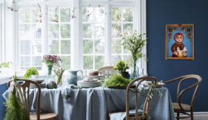 Ora le figure femminili sono anche su vecchi elementi originali di una cattedra scolastica degli anni ’60. Ridipinta di azzurro nel corso del tempo, Anna e Lorenzo ne hanno recuperato tre pezzi: un cassetto grande, uno piccolo e uno sportello. Maniglie, cardini e ferramenta sono originali, così come scarabocchi, macchie di colla e puntine, ne garantiscono la provenienza.