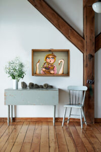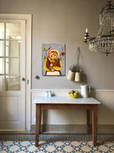 Anna ha dipinto tre fanciulle dai grandi occhi e con in mano fiori ed animali come augurio di prosperità. Inevitabile il solito gioco di sguardi tra la protagonista e l’uccellino appoggiato in testa. I decori floreali e le pose dipinte, sono liberamente tratti da quelli presenti sui carretti originali. Sulla maniglia è appeso un cuore in legno laccato di rosso.