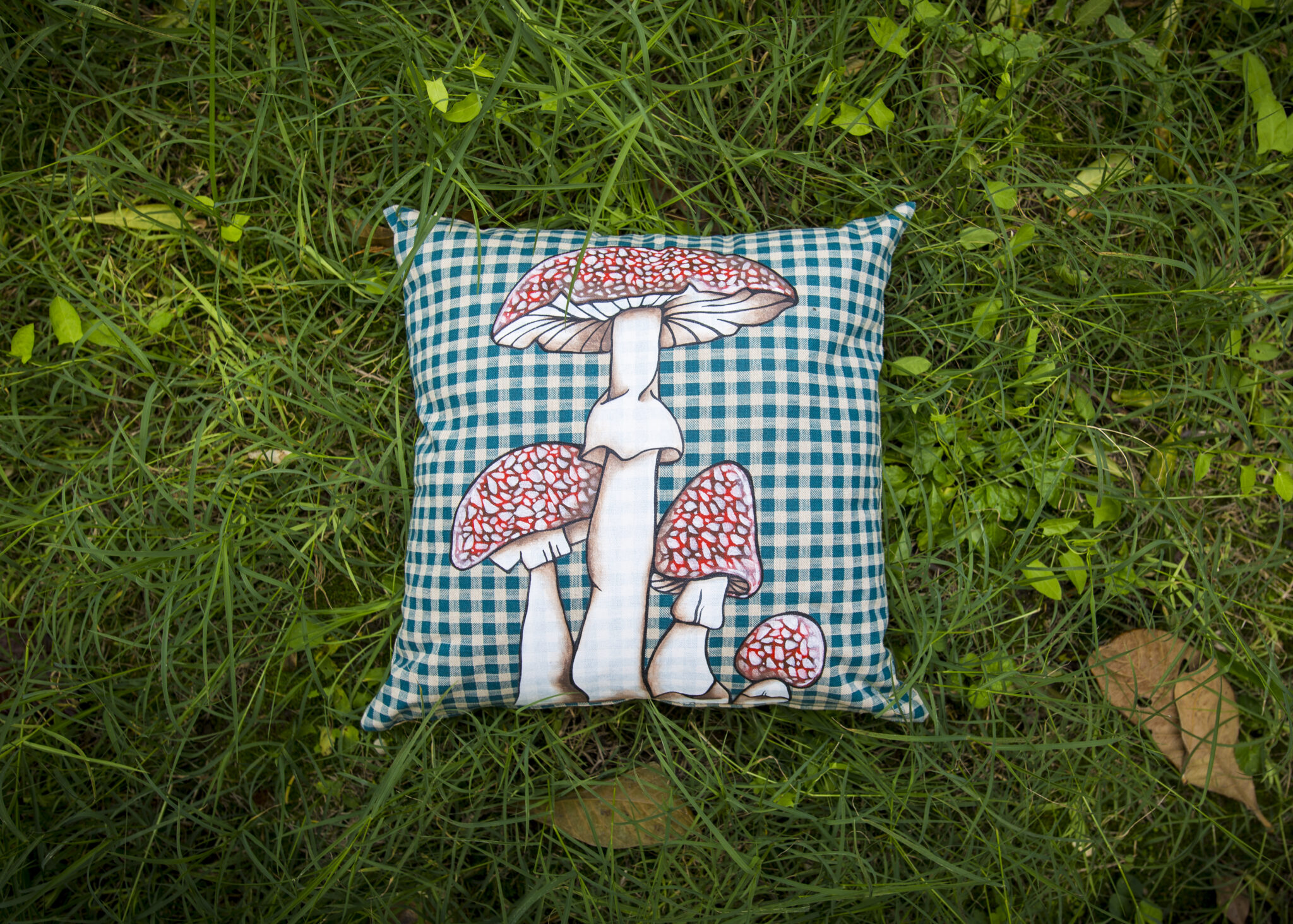 Cuscino con funghi a quadretti