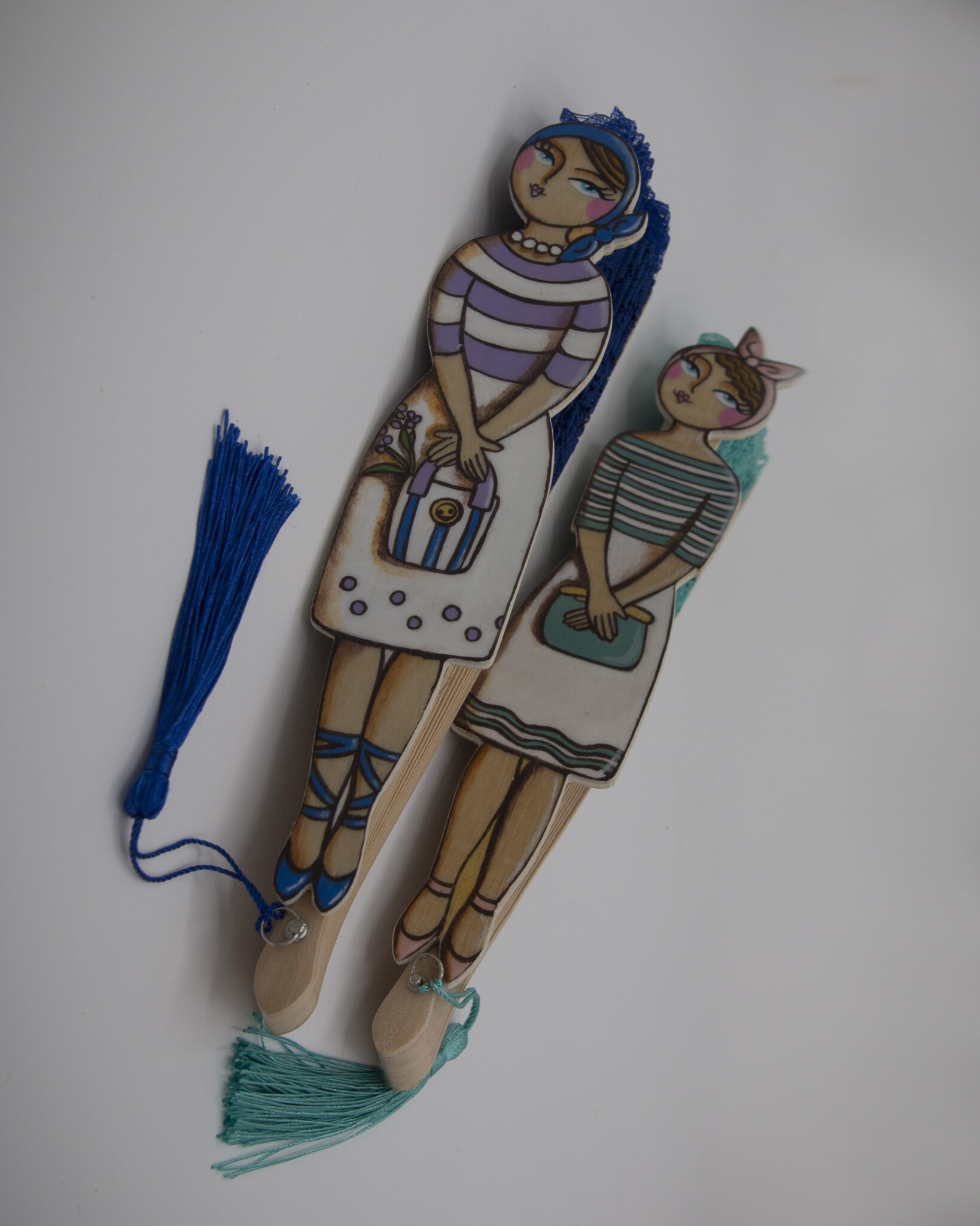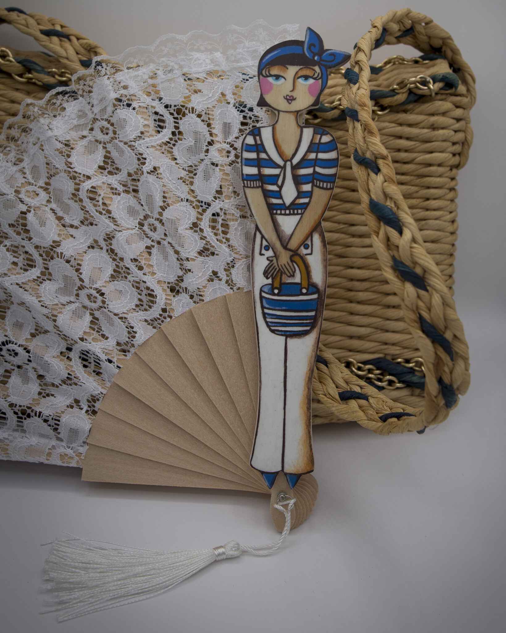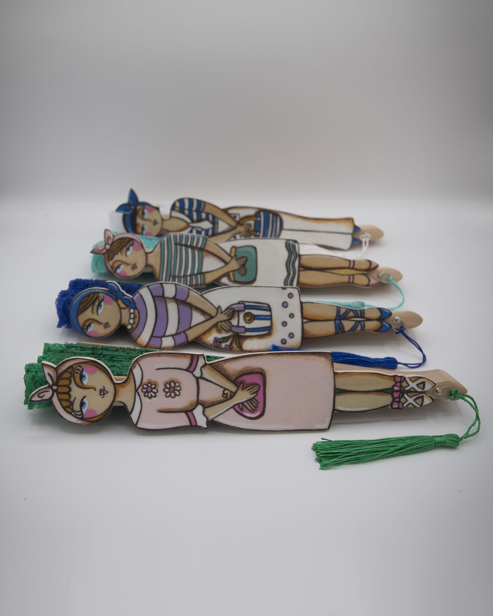 La quinta essenza della donna elegante e romantica. Dal sapore vintage, sono in pizzo ognuno di un colore diverso. La donnina in legno dipinta a mano è unica e irripetibile. Dal look retrò e i grandi occhioni, ognuna porta con sè una borsetta.