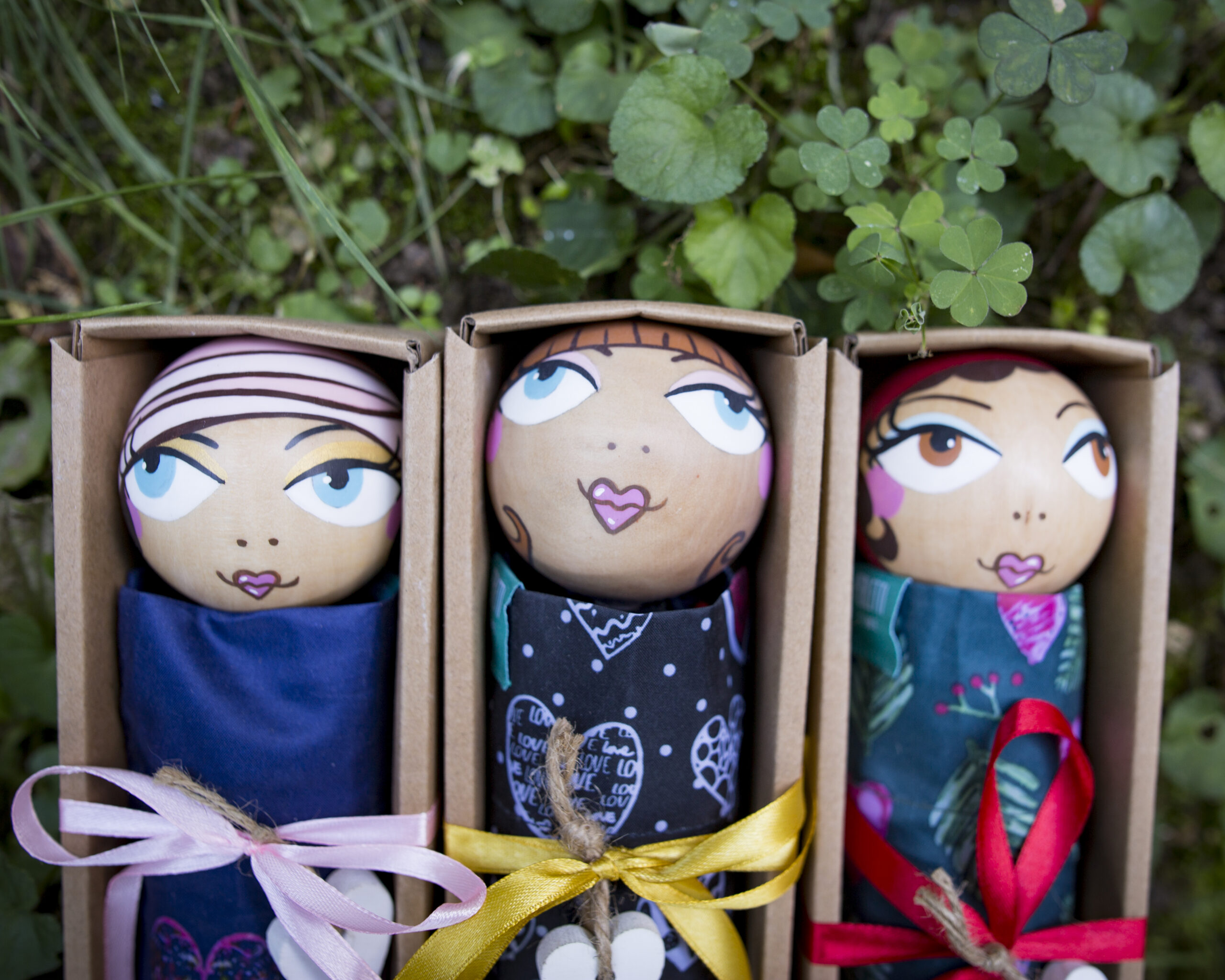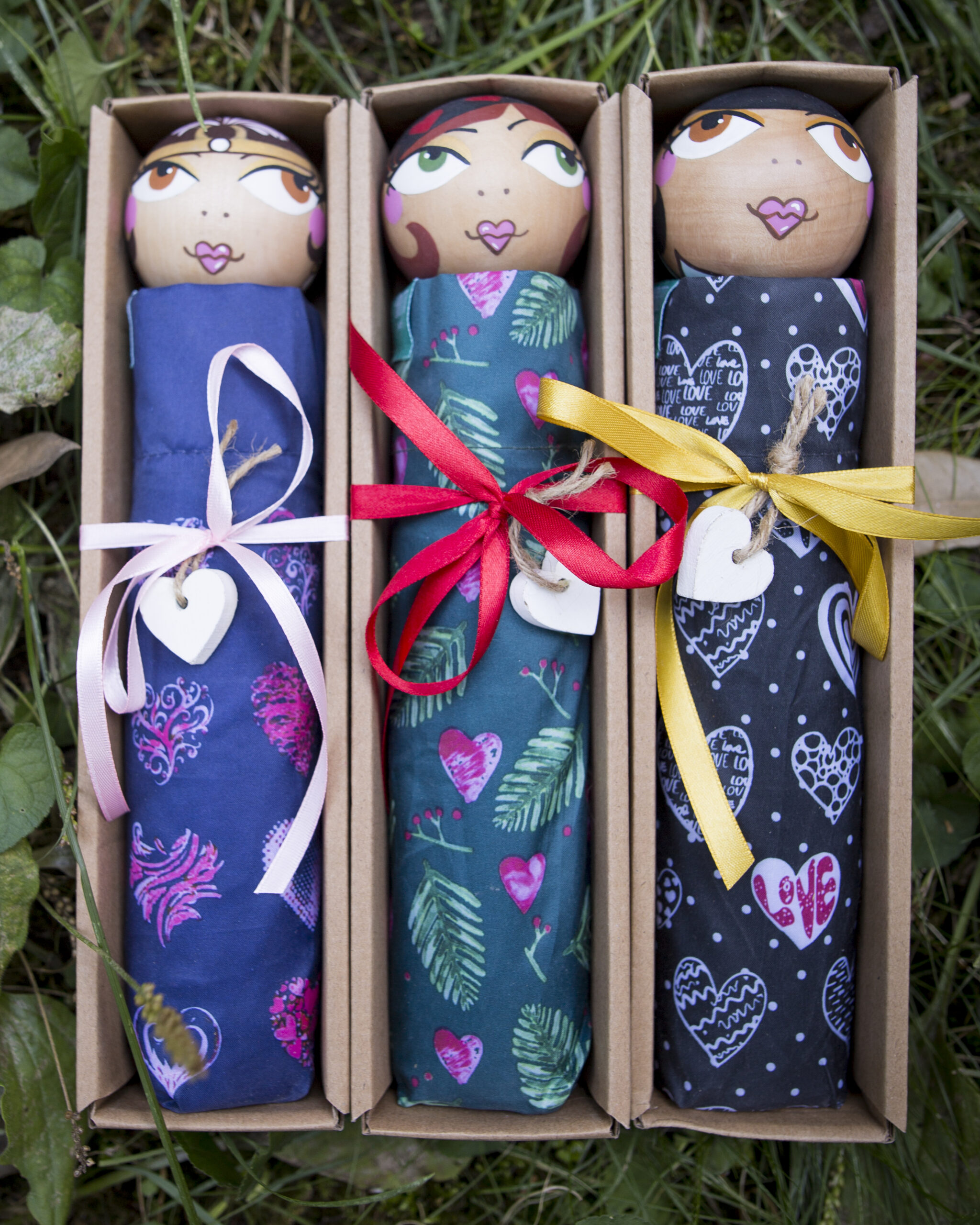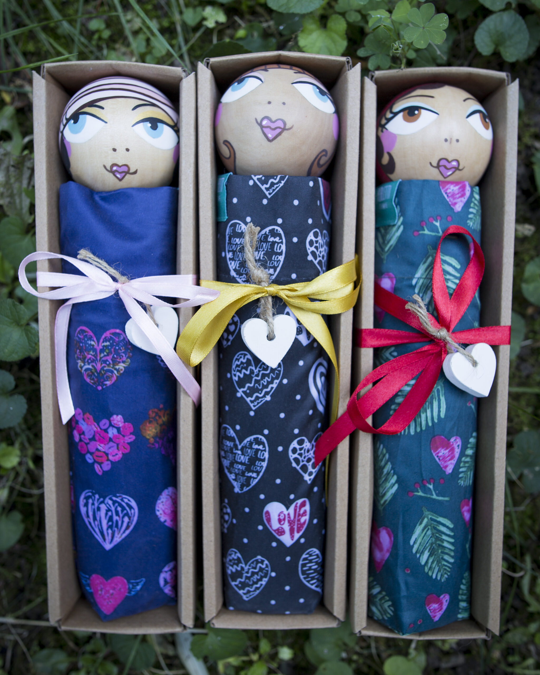 Dopo aver rimosso l’impugnatura industriale, Lorenzo realizza manici originali in legno dipinti a mano, uno per uno. Le sfere diventano volti simpatici e colorati, perfettamente abbinati ai tessuti e agli astucci coordinati.