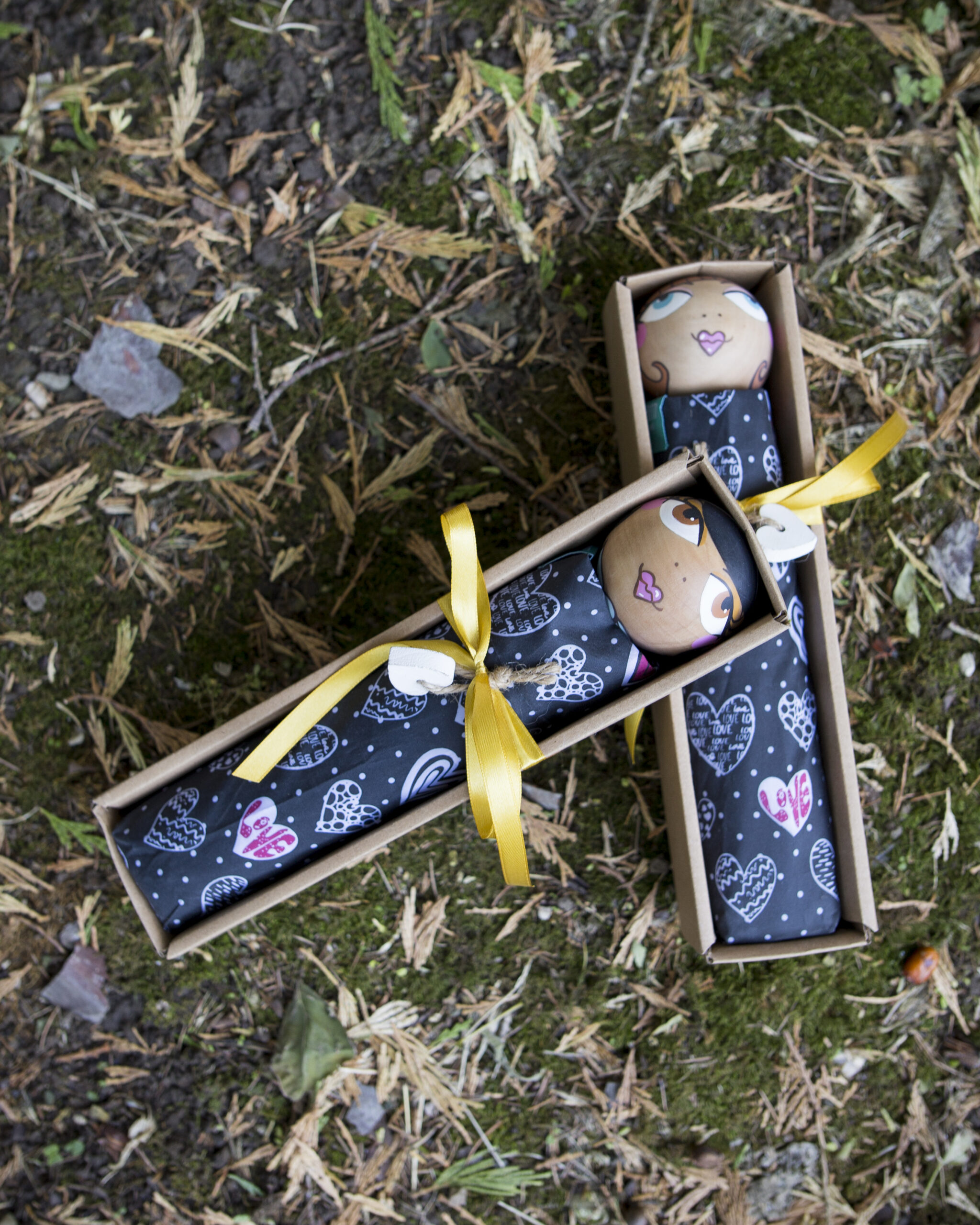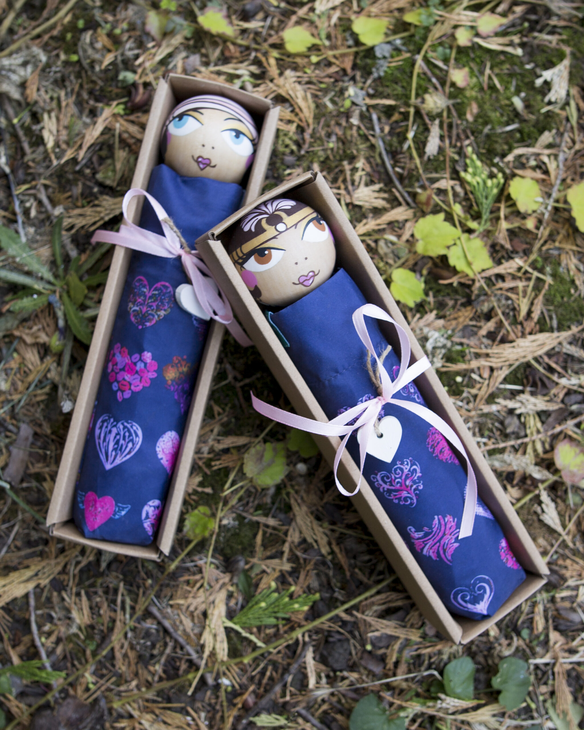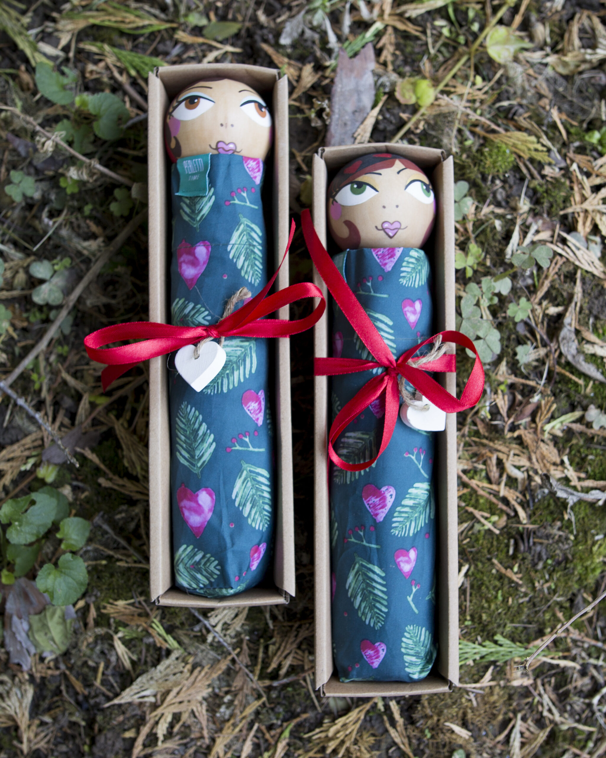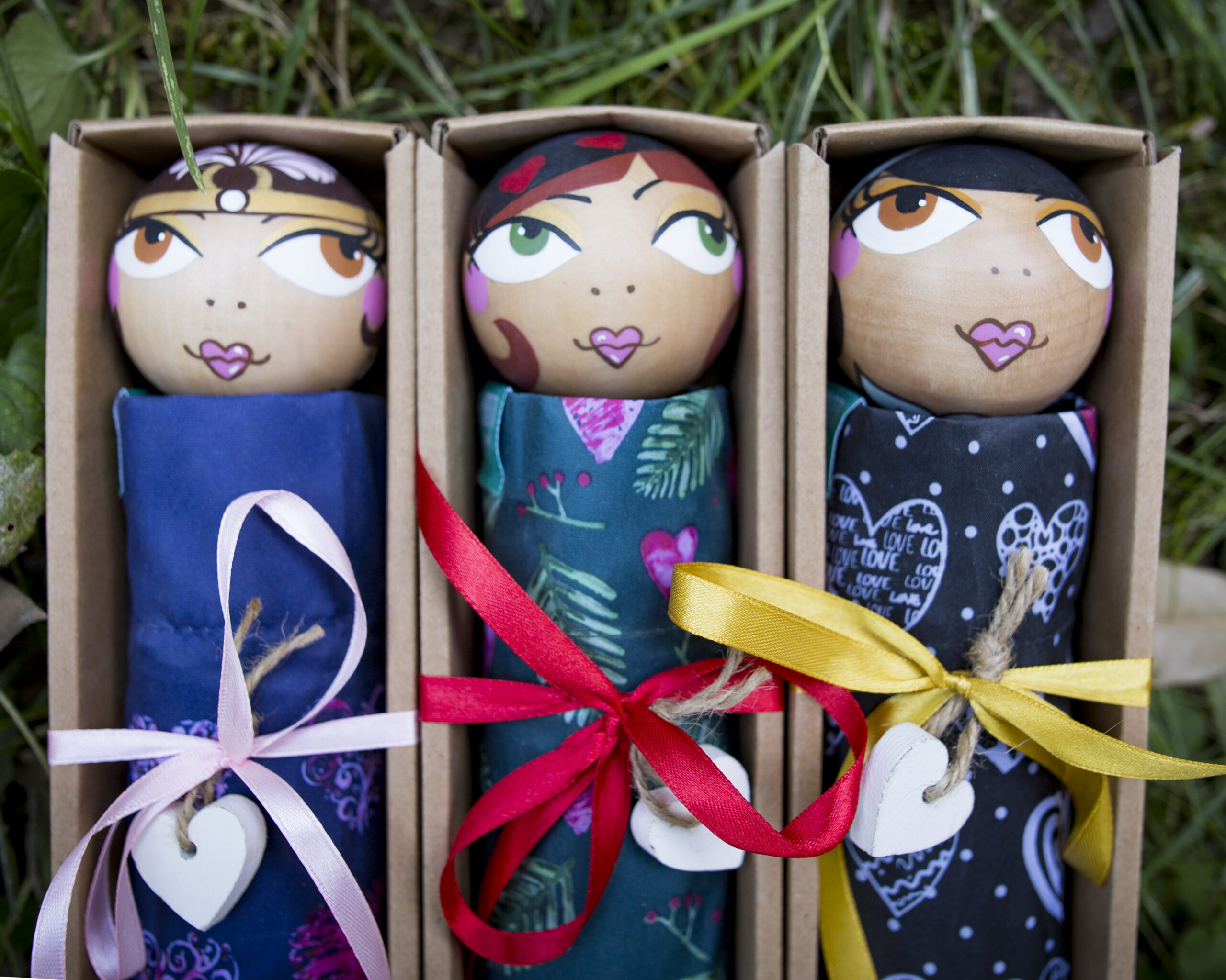 Dopo aver rimosso l’impugnatura industriale, Lorenzo realizza manici originali in legno dipinti a mano, uno per uno. Le sfere diventano volti simpatici e colorati, perfettamente abbinati ai tessuti e agli astucci coordinati.