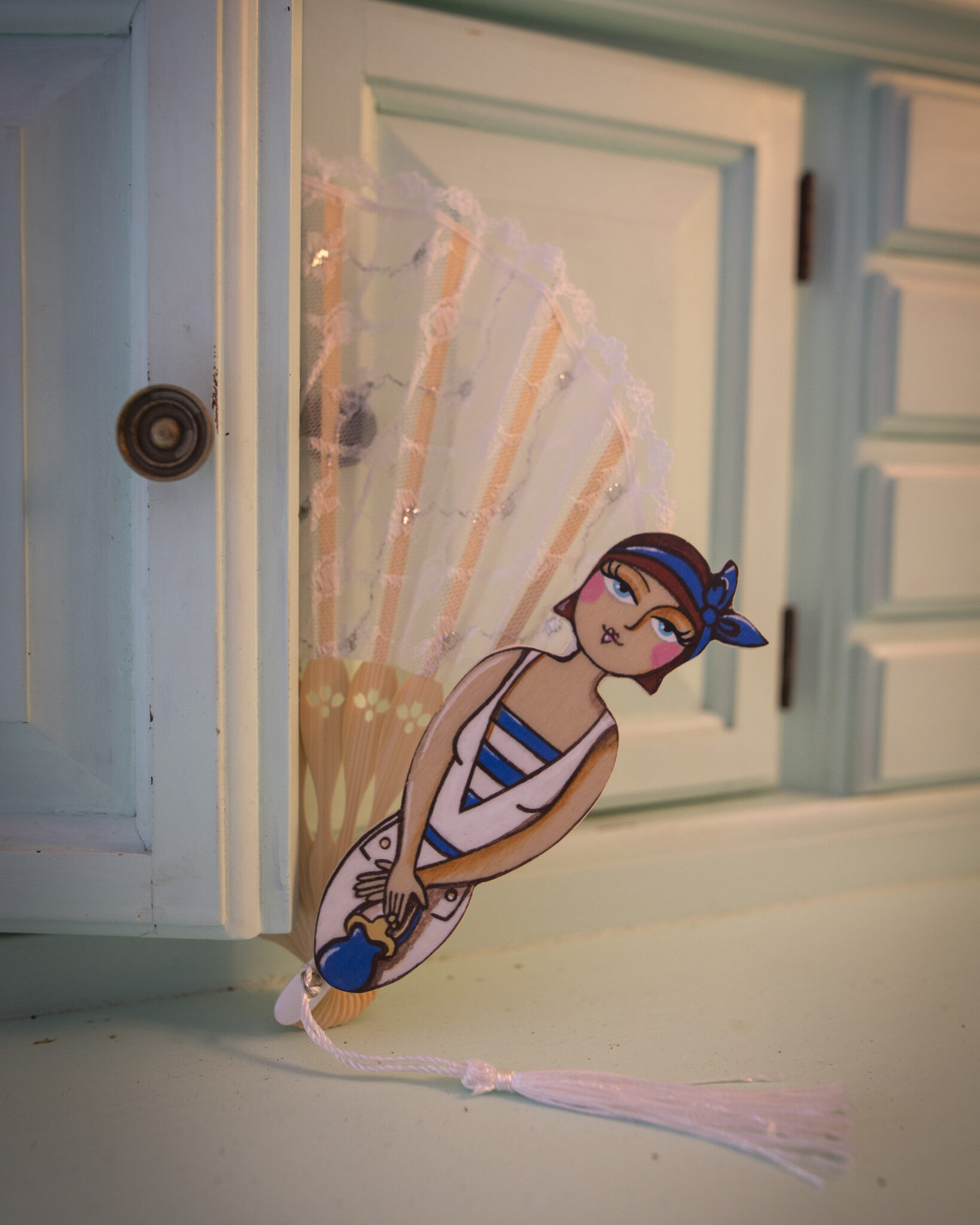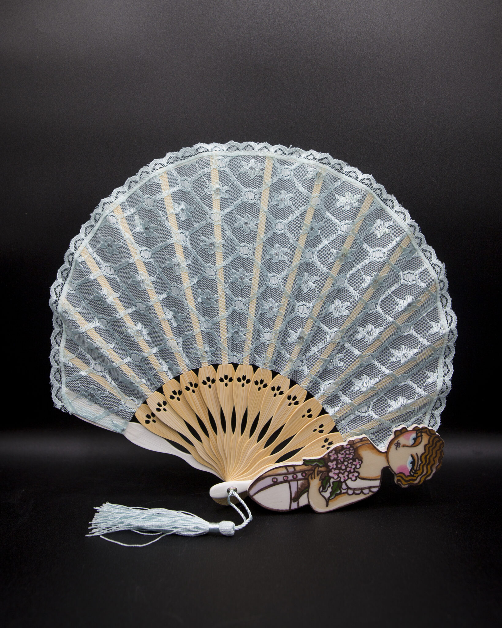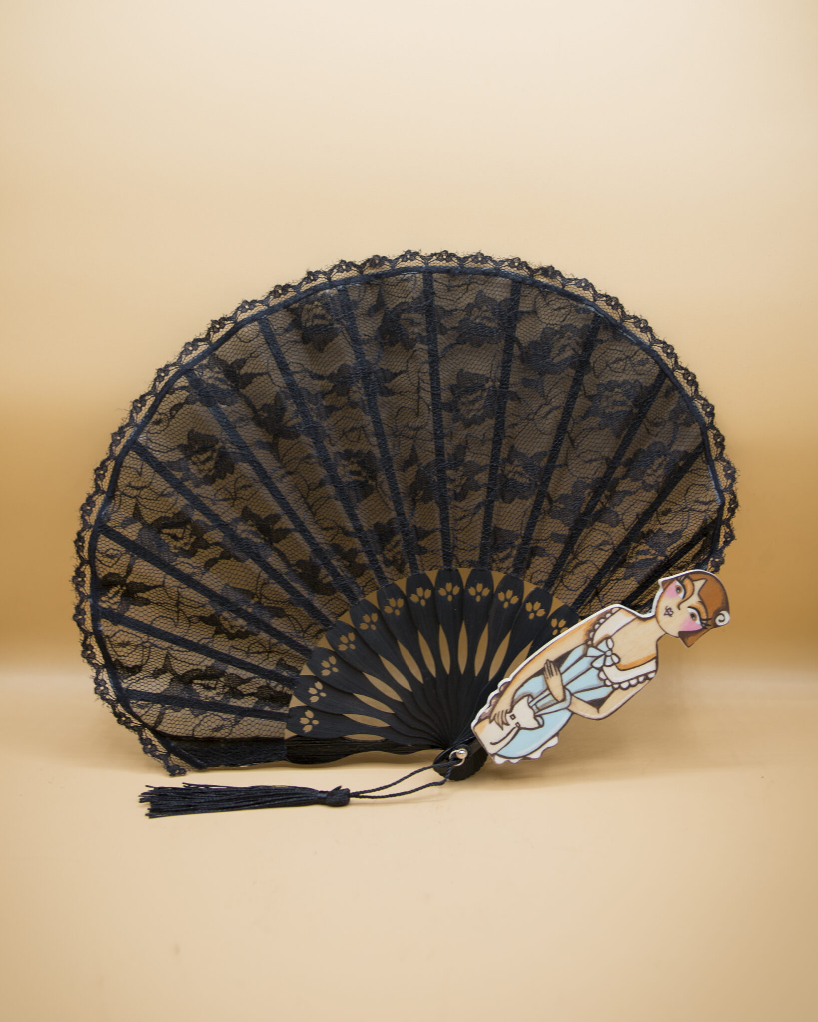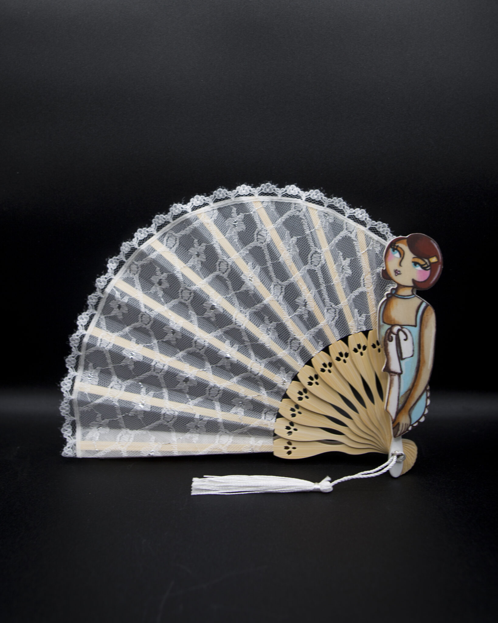 Le stecche in bambù conferiscono leggerezza e robustezza, mentre le figurine in legno dipinte a mano aggiungono un tocco artistico e raffinato. Ogni ventaglio è un pezzo unico, una bambolina dai grandi occhioni che indossa abbigliamento intimo d’altri tempi, evocando un’epoca di charme e mistero.