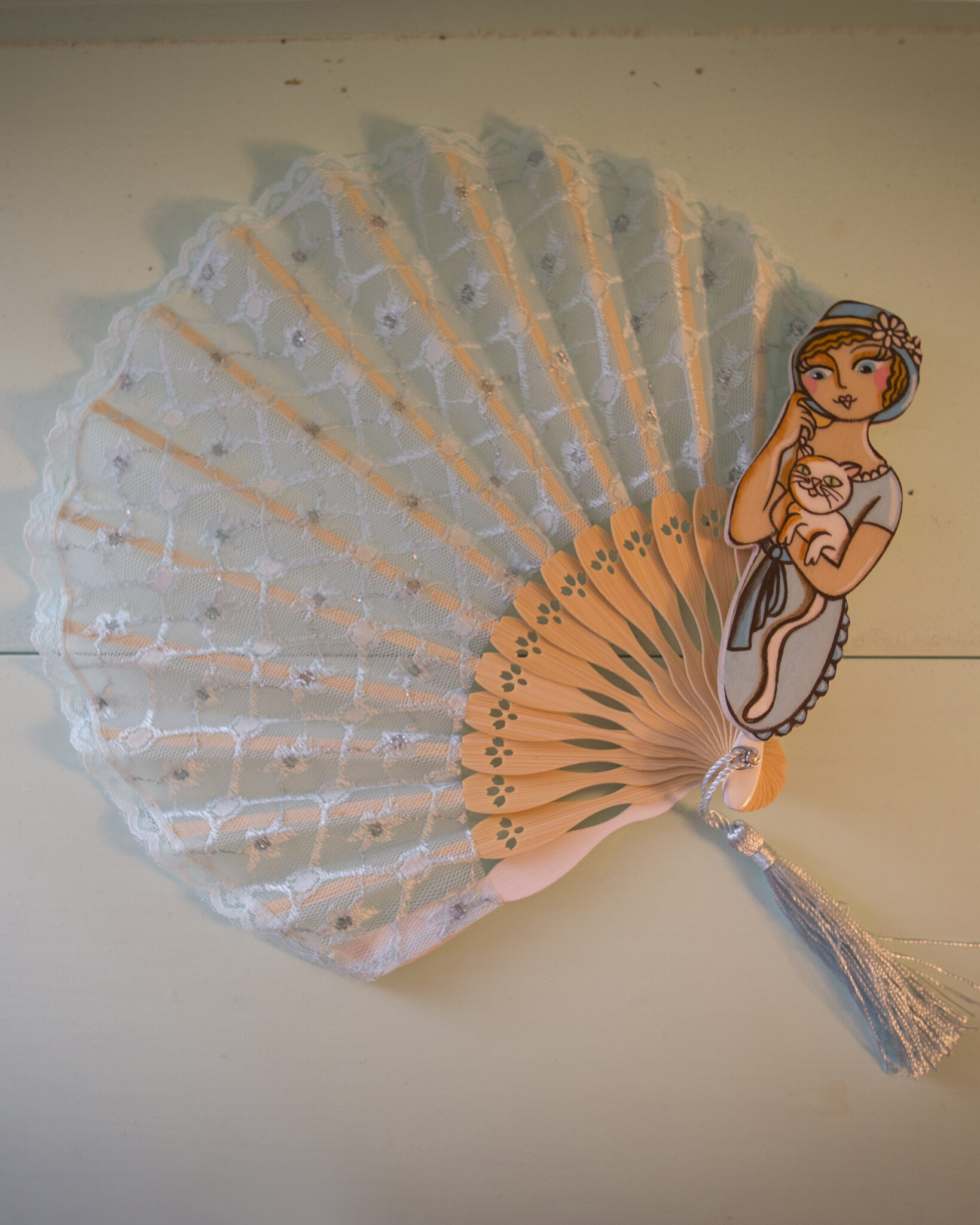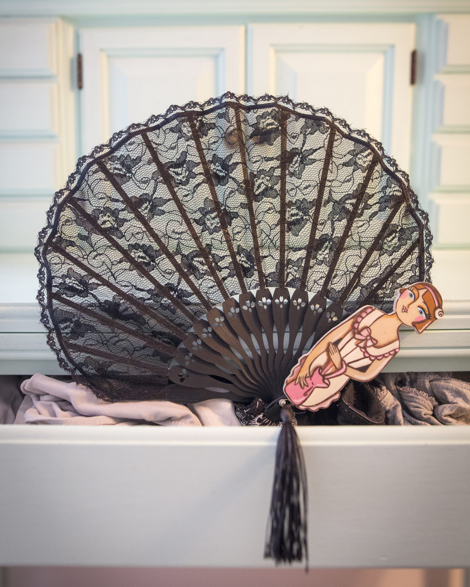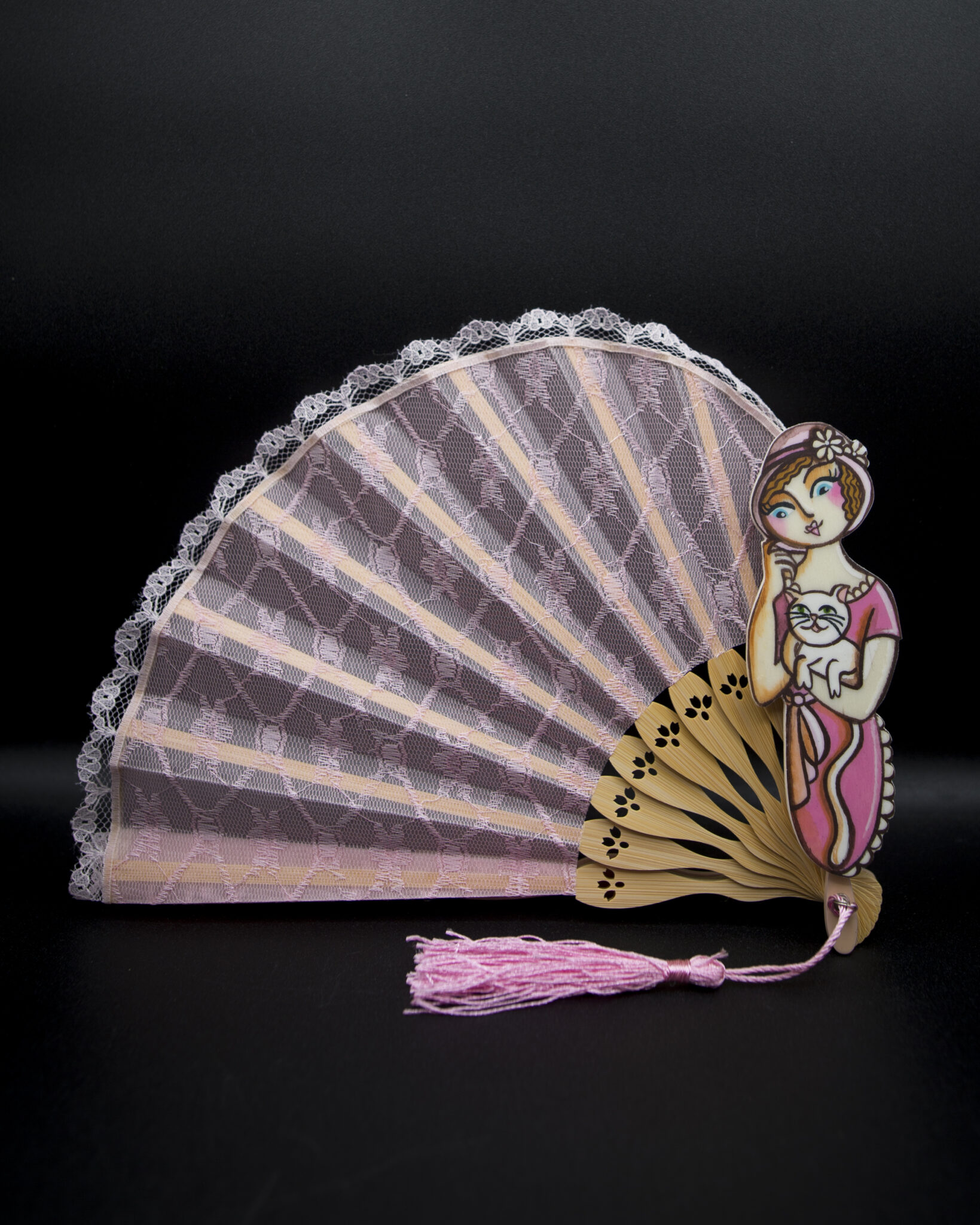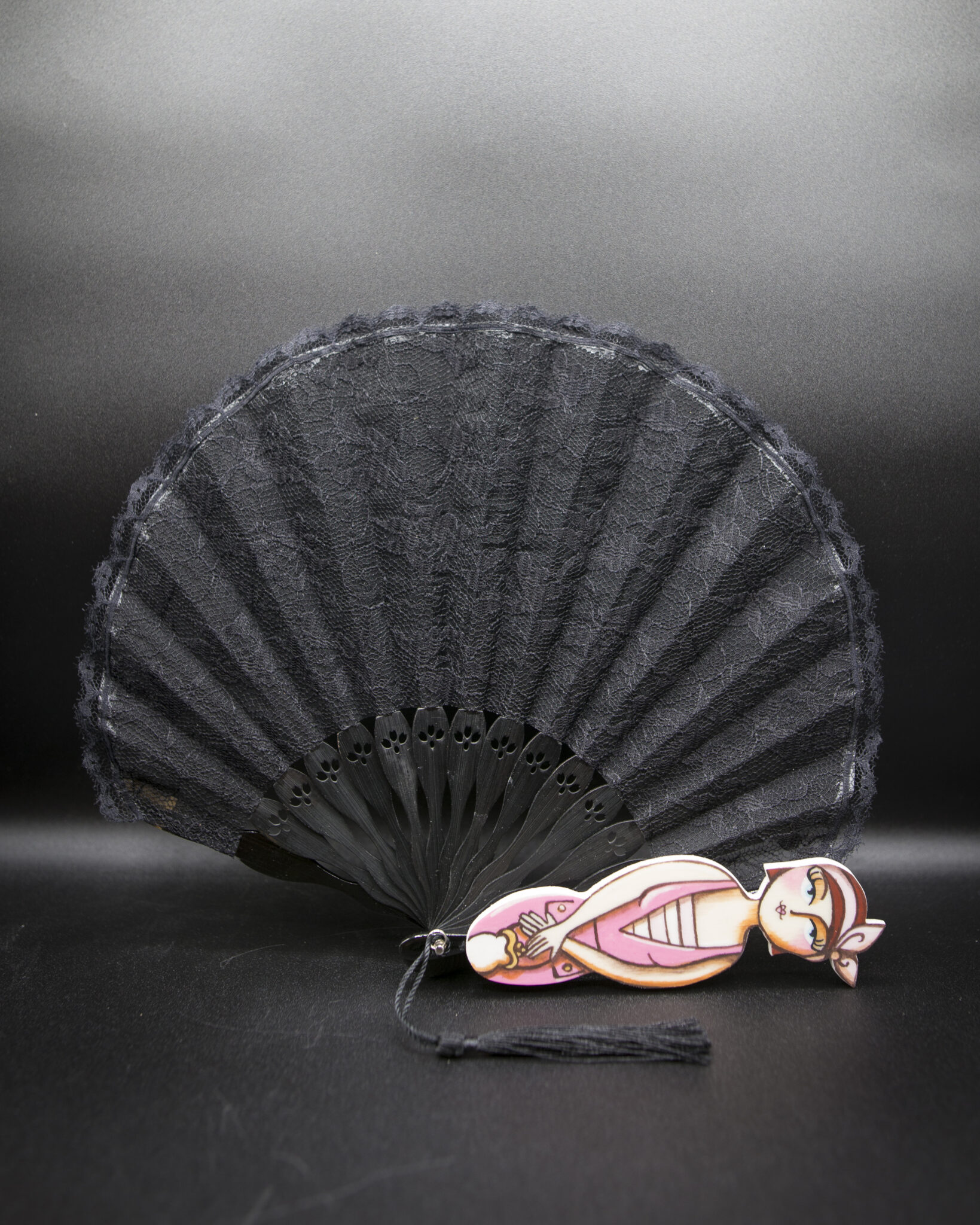 Le stecche in bambù conferiscono leggerezza e robustezza, mentre le figurine in legno dipinte a mano aggiungono un tocco artistico e raffinato. Ogni ventaglio è un pezzo unico, una bambolina dai grandi occhioni che indossa abbigliamento intimo d’altri tempi, evocando un’epoca di charme e mistero.