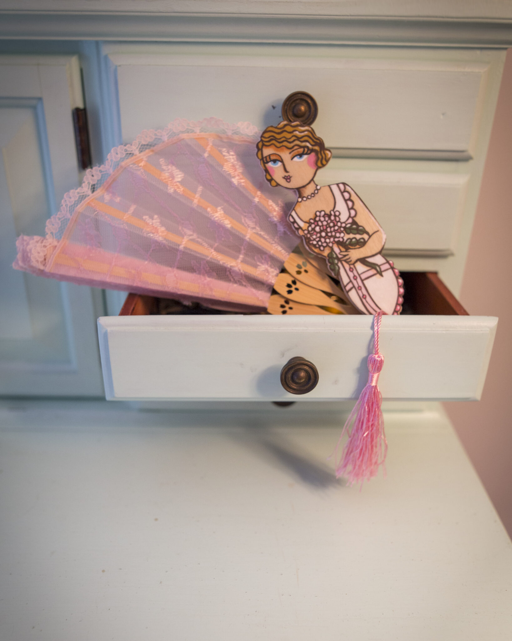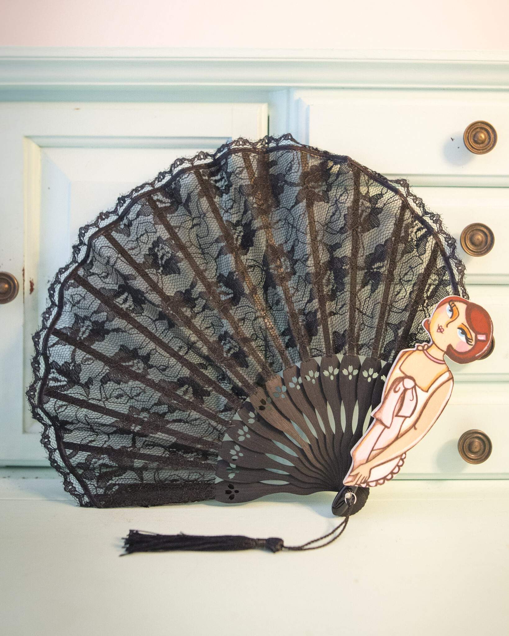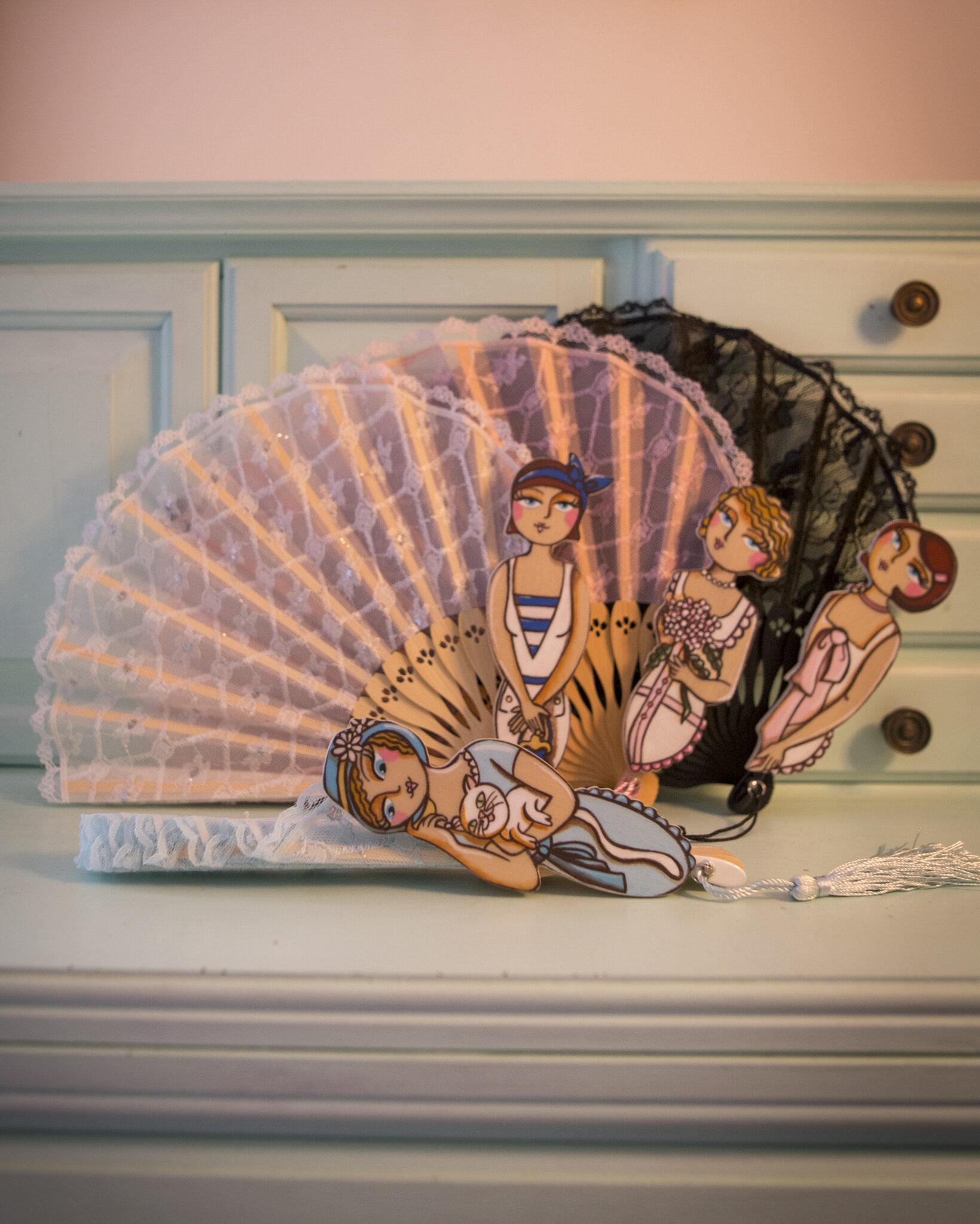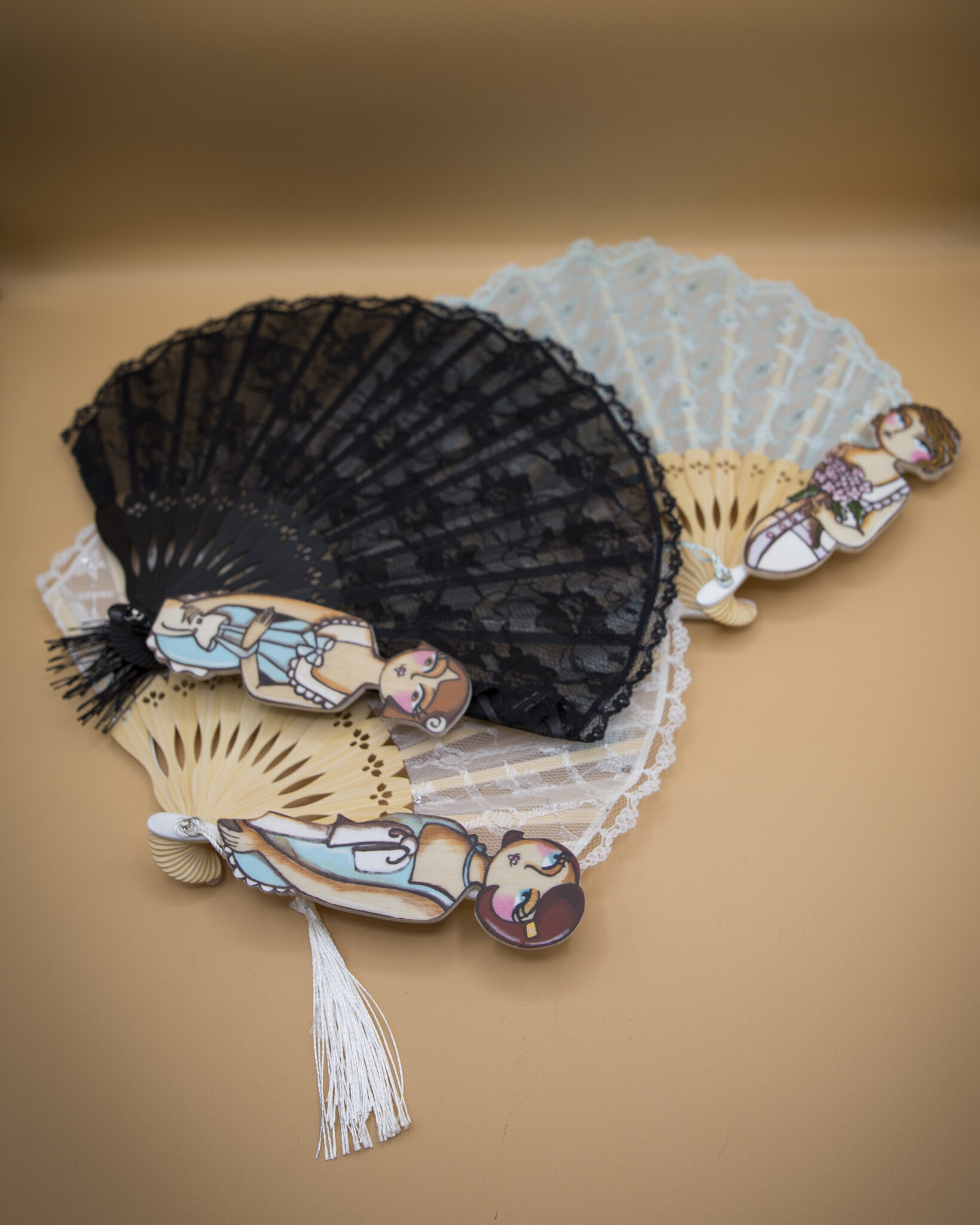 Le stecche in bambù conferiscono leggerezza e robustezza, mentre le figurine in legno dipinte a mano aggiungono un tocco artistico e raffinato. Ogni ventaglio è un pezzo unico, una bambolina dai grandi occhioni che indossa abbigliamento intimo d’altri tempi, evocando un’epoca di charme e mistero.