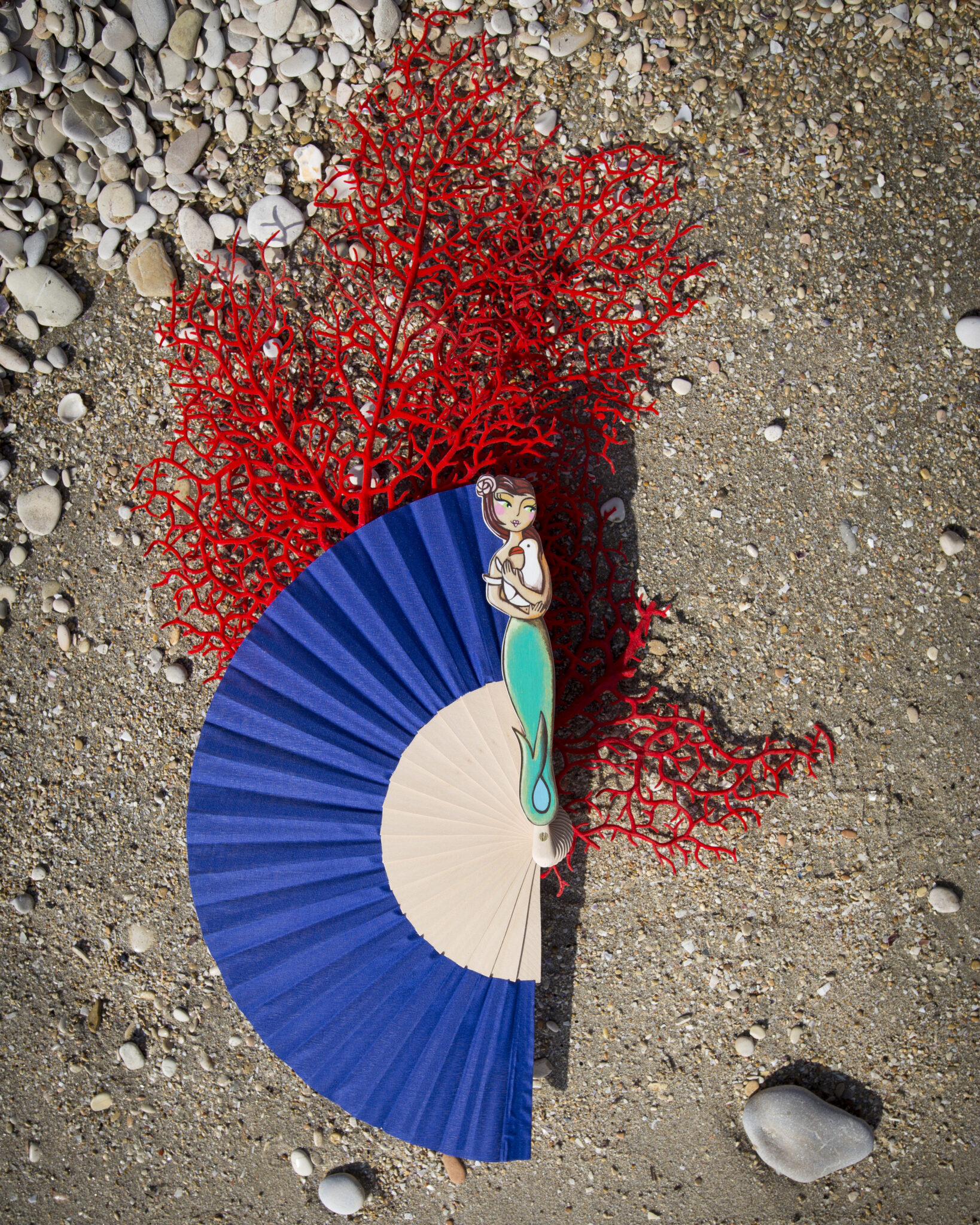 Per celebrare questa affascinante figura, abbiamo creato una collezione di ventagli realizzati a mano, dedicati alle sirene e alla loro magia. Ogni ventaglio è un’opera d’arte, frutto di un’attenta lavorazione artigianale che valorizza la bellezza e l’unicità di ogni pezzo. Le silhouette delle sirene sono ritagliate nel legno e poi dipinte, con dettagli delicati e raffinati che catturano l’essenza di queste creature mitiche. I tessuti, invece, sono scelti in tre gradazioni di azzurro, dal più chiaro al più intenso, richiamando le sfumature del mare e creando un effetto visivo di grande fascino.