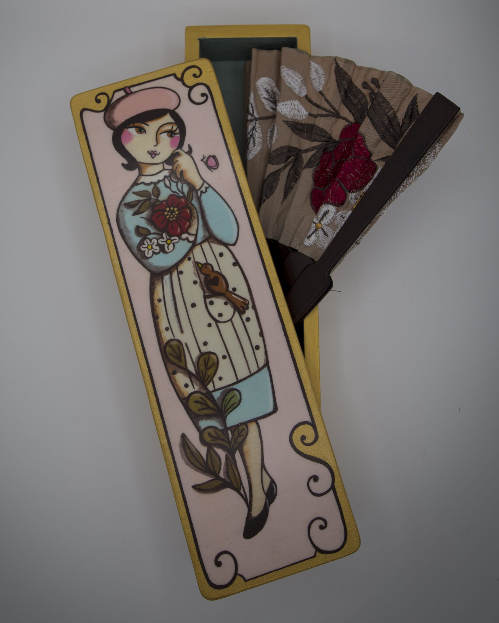 Ma non è tutto: il pezzo è presentato in una scatola in legno dipinta a mano, che rende il tutto ancora più speciale. Sul coperchio, troverete la deliziosa Pupa del Biroccio, dedicata ai fiori, che richiama i ricami presenti sul ventaglio stesso.