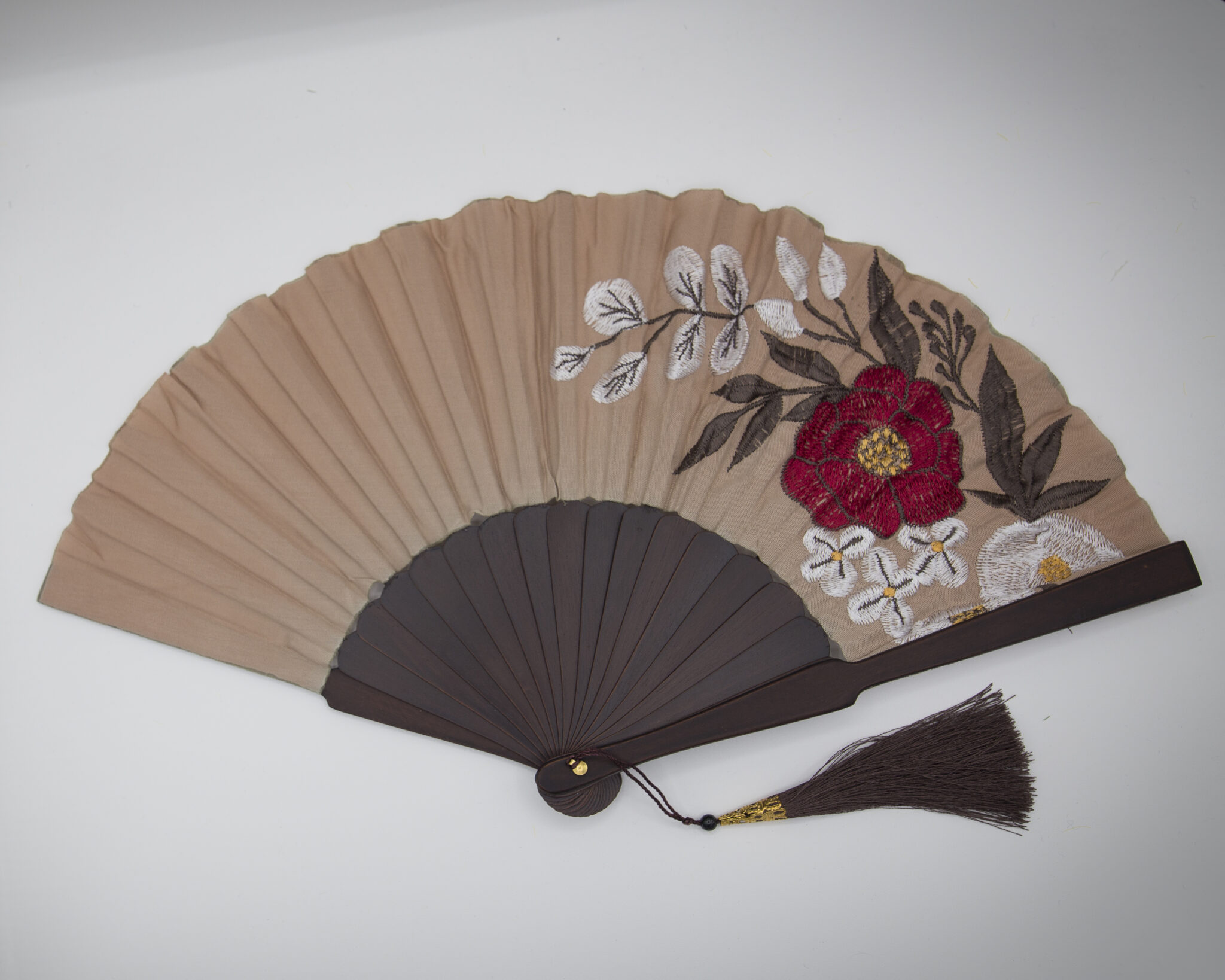 Realizzato in tessuto ricamato e legno pregiato, il ventaglio è accompagnato da un astuccio in seta abbinato, perfetto per conservarlo con cura.