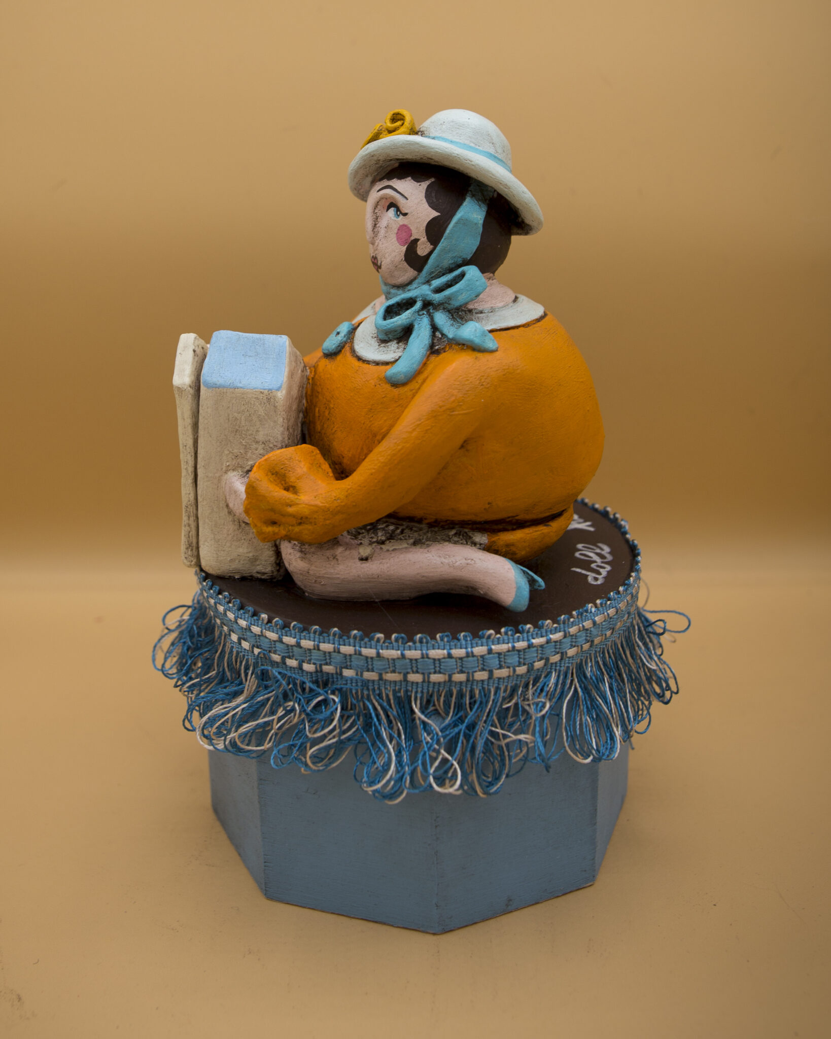 Sotto di lei una scatola in legno esagonale, racchiude il meccanismo di un carillon dalla dolce melodia.