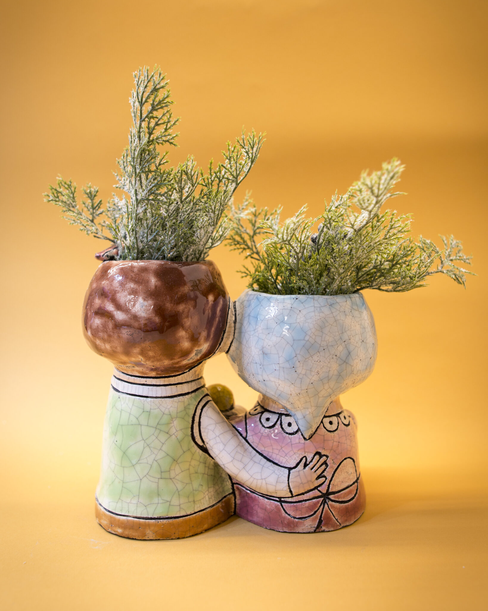La Natività Biroccia in ceramica raku. Doppio vaso da appoggio di medio formato con buco interno per il drenaggio.