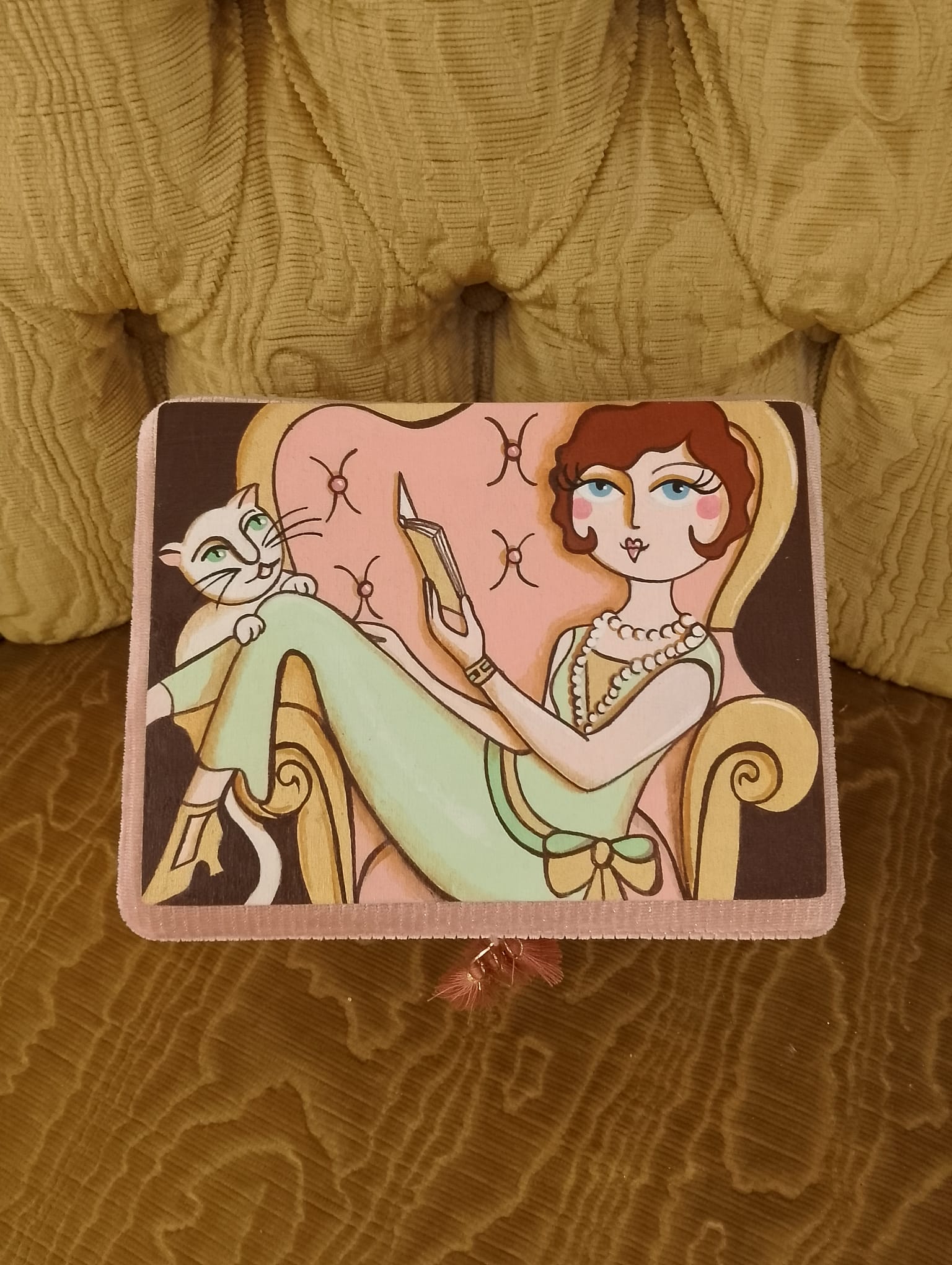 • Coperchio artistico dipinto a mano, con protagonista una flapper in compagnia del suo gatto.