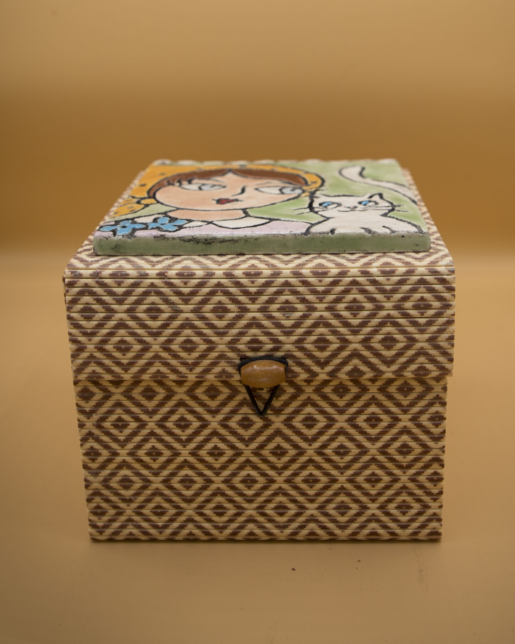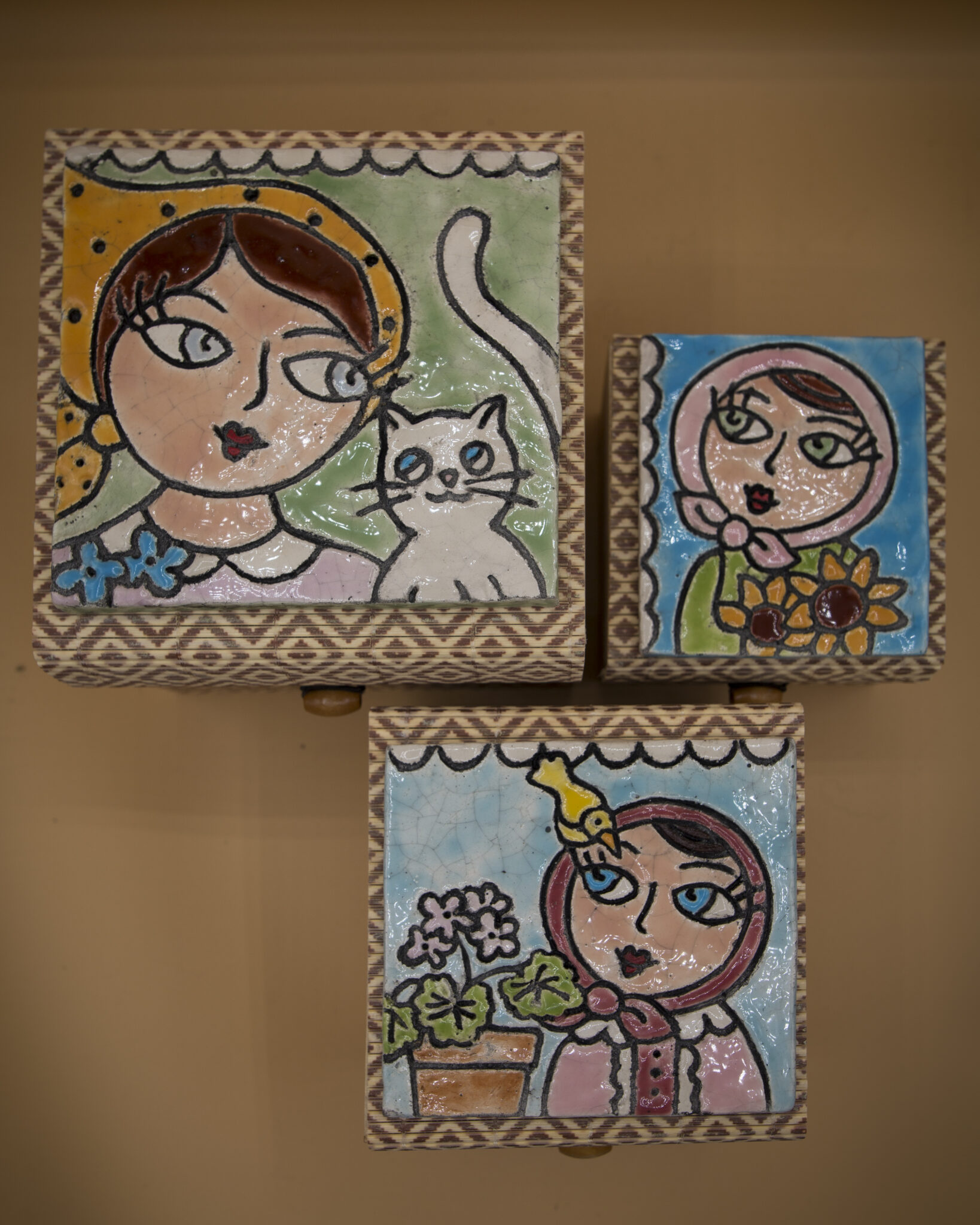Questa volta la nostra contadinella marchigiana è rappresentata su di una formella in ceramica raku applicata ad una scatola in legno dal sapore orientale.