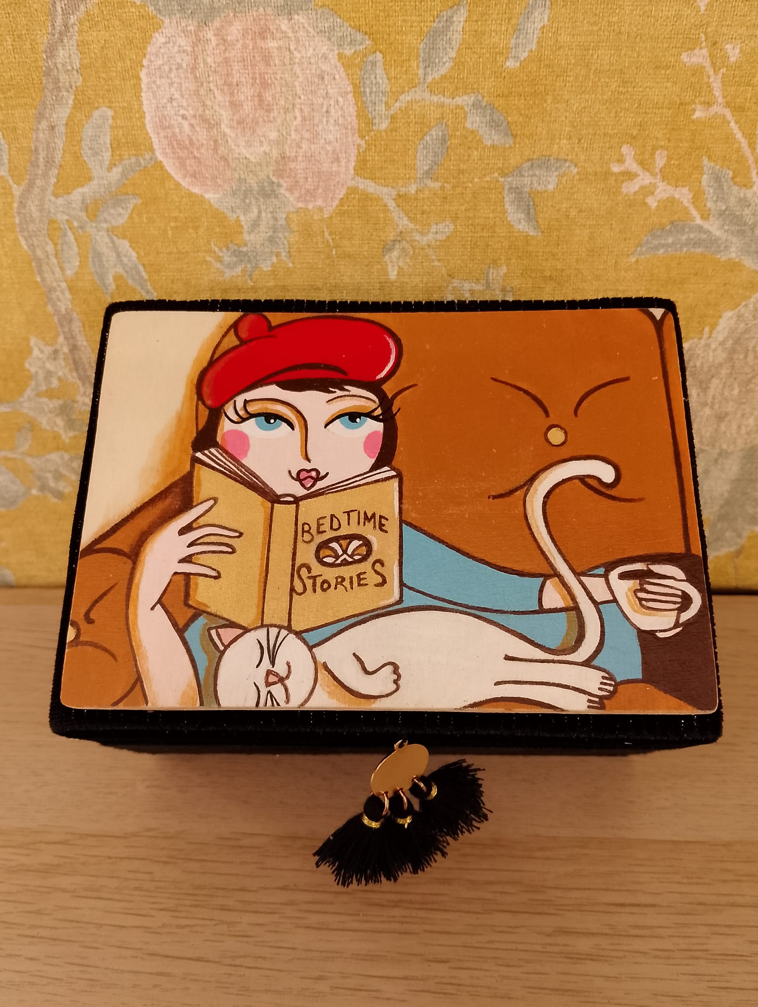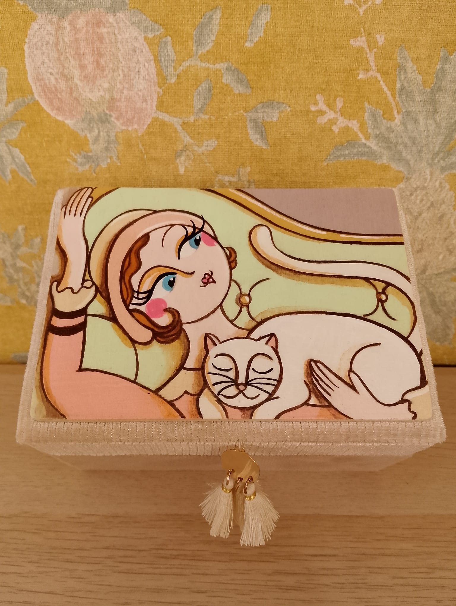 La linea Flapper si arricchisce con due eleganti scatole portagioie rettangolari, pensate per chi ama l’organizzazione senza rinunciare allo stile. Realizzate in velluto morbido e rifinite con cura artigianale, si distinguono per il loro coperchio in legno dipinto a mano: una scena intima e delicata, che ritrae una giovane donna anni Venti rilassata sul divano insieme al suo gatto. Ogni soggetto è diverso e racconta una piccola storia di dolcezza quotidiana.
