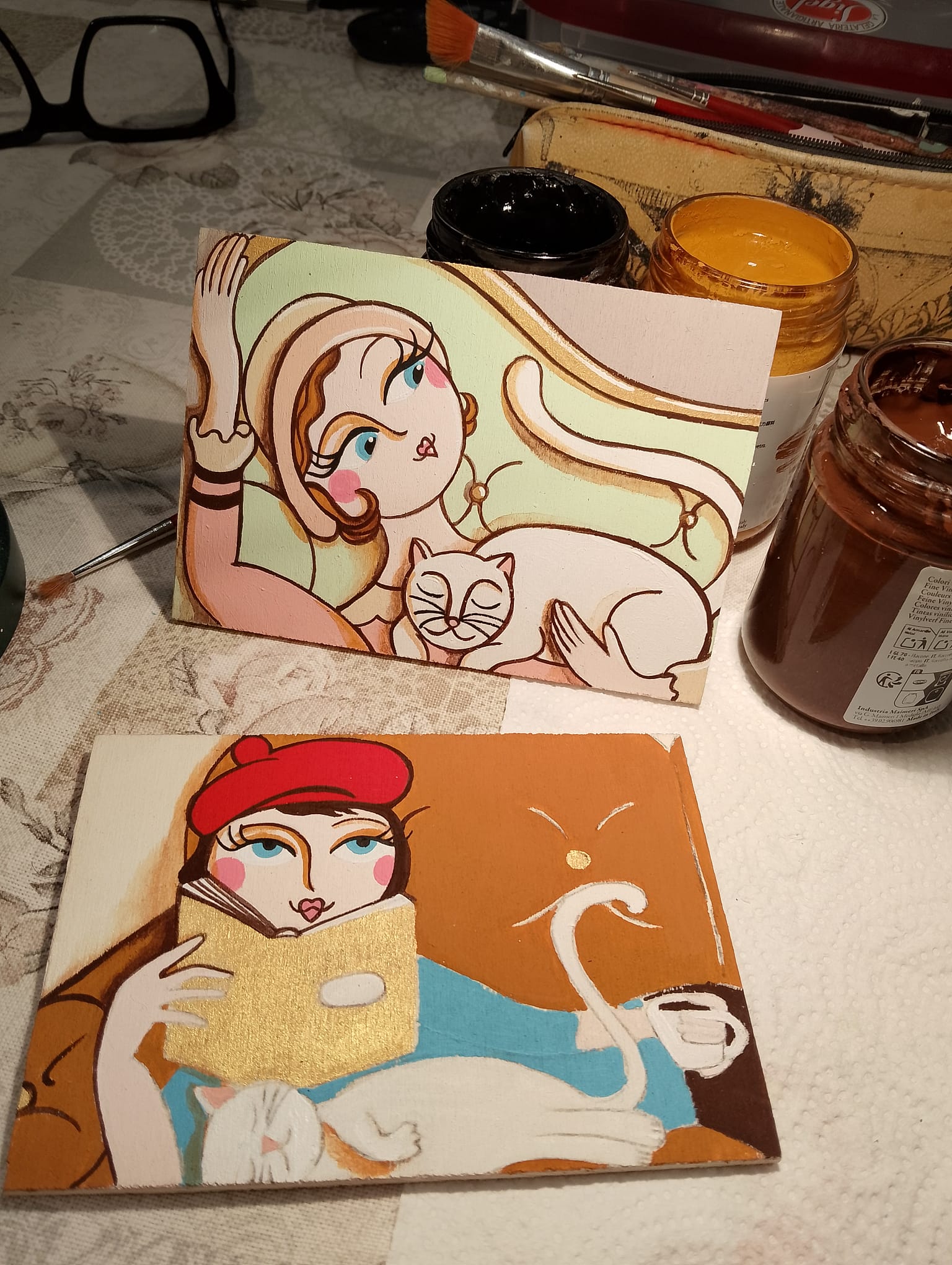 • Coperchio artistico dipinto a mano, con protagonista una flapper in compagnia del suo gatto, in due versioni differenti.