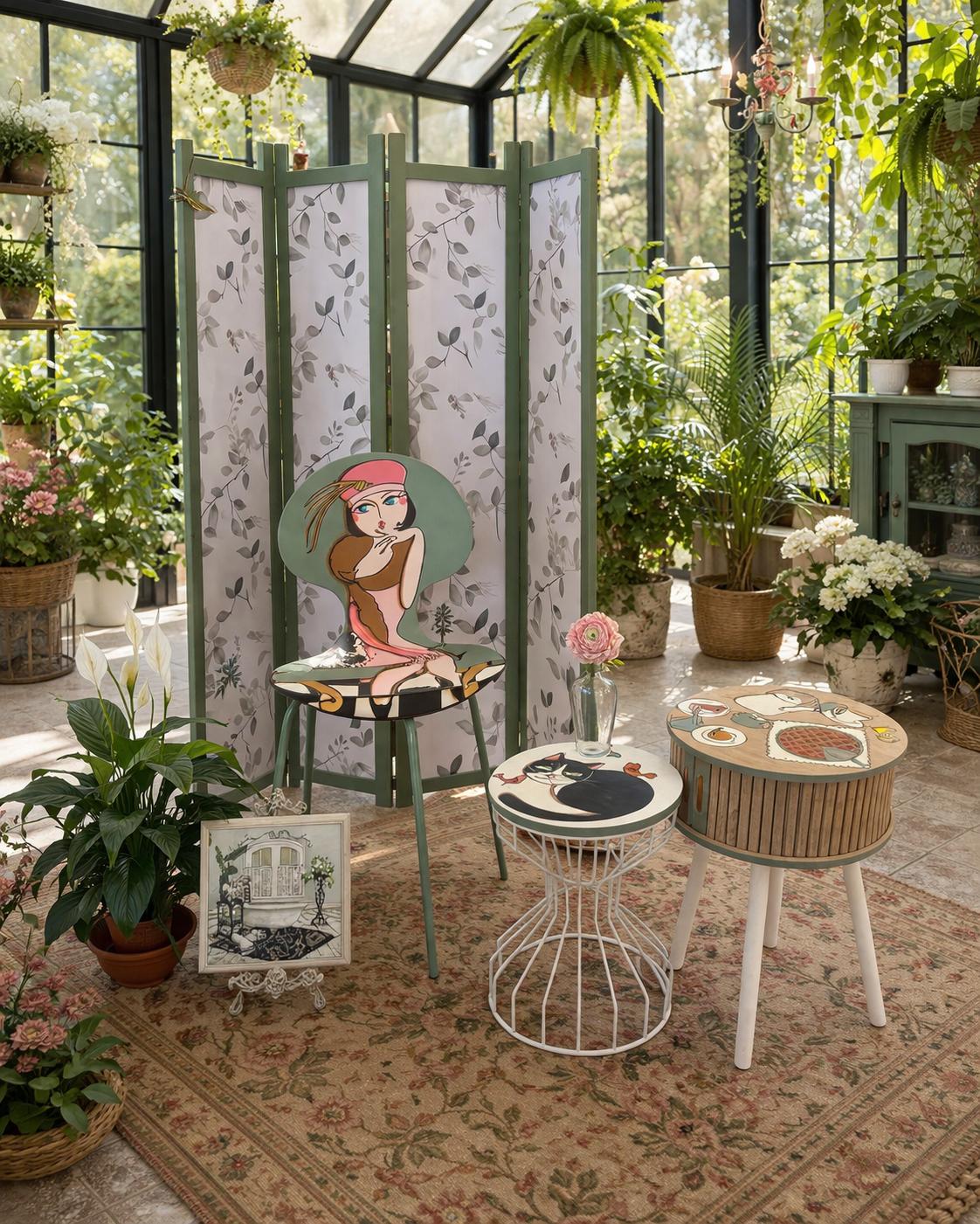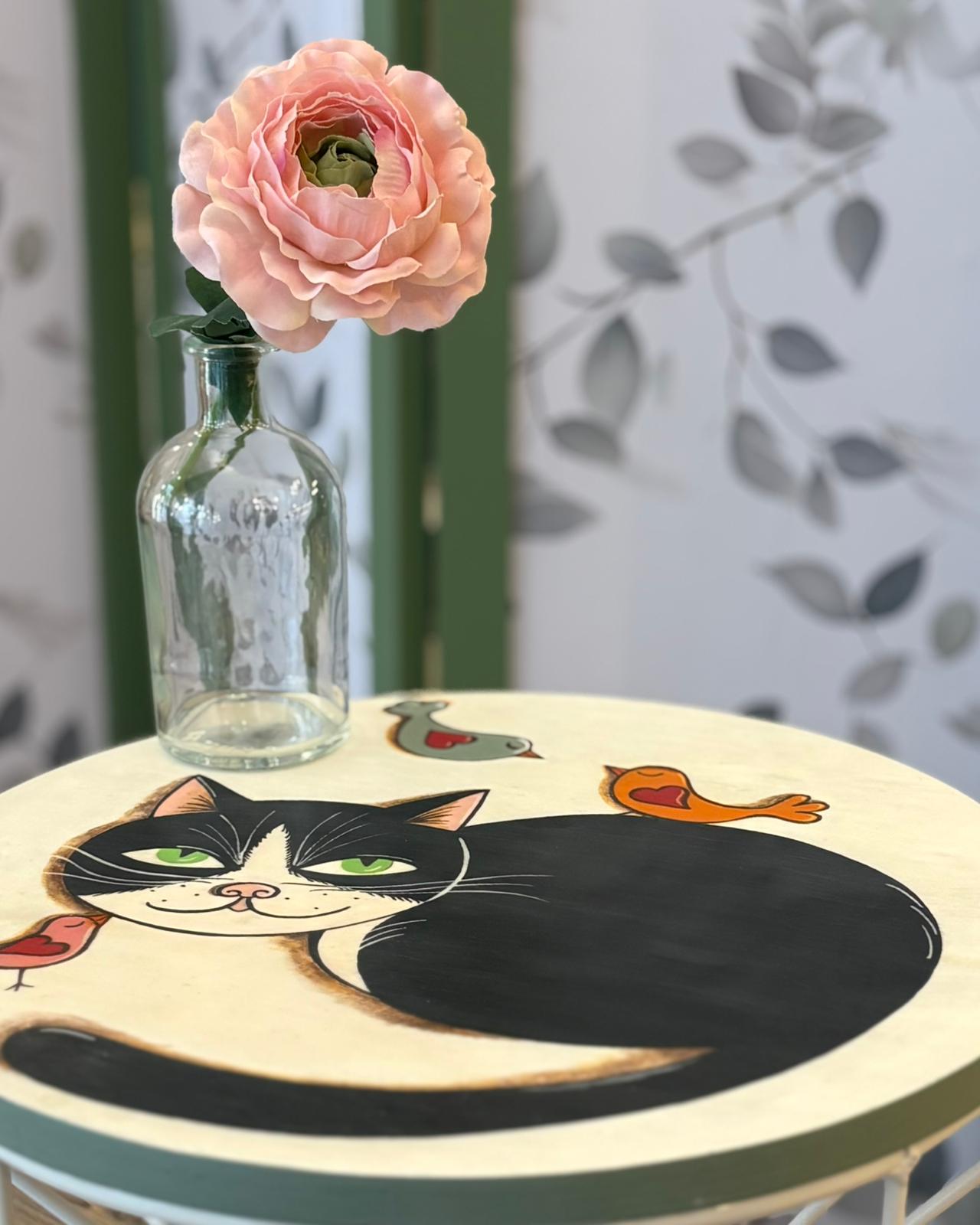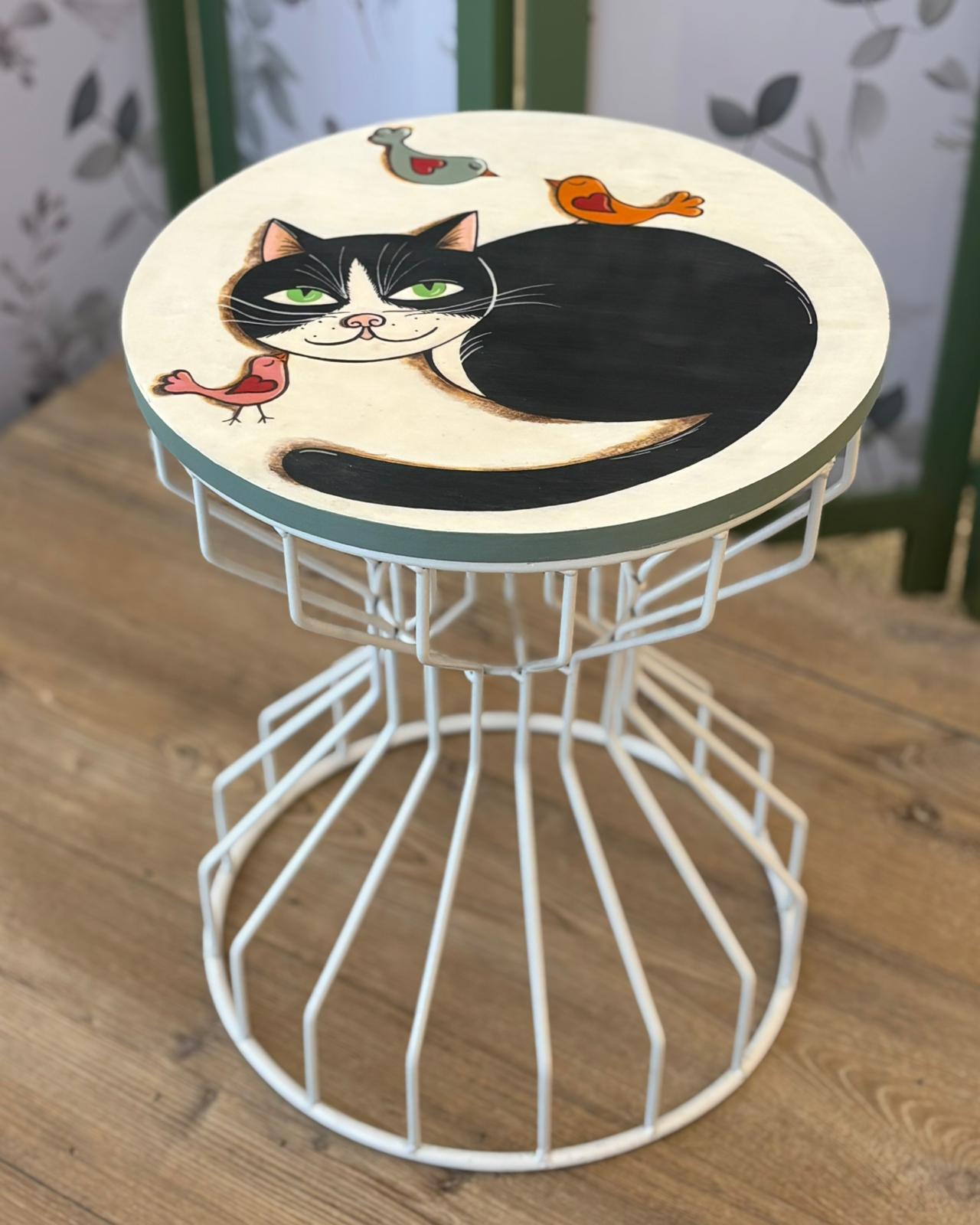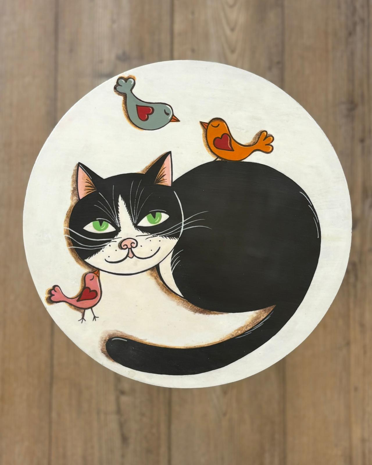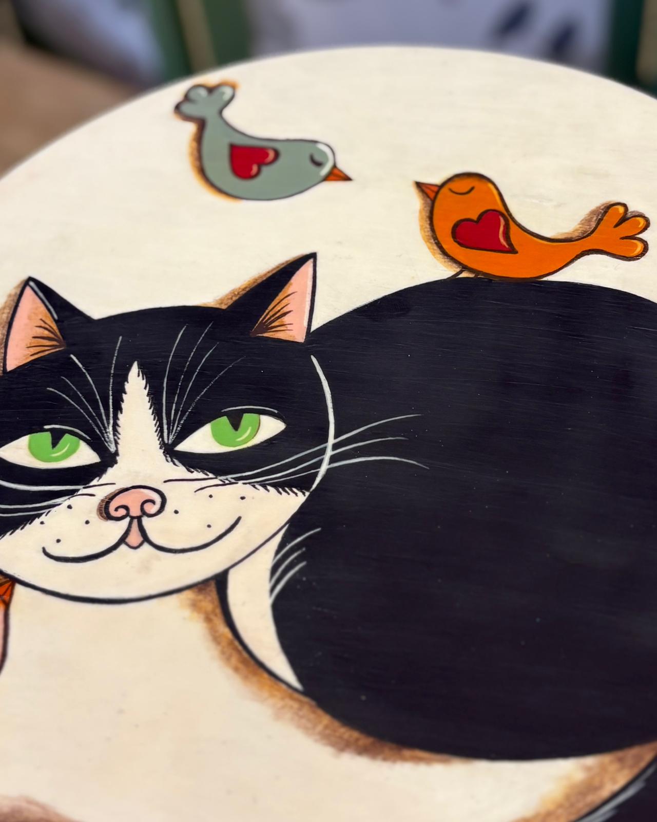 • Seduta Artistica: Il top in legno è una vera tela su cui è ritratto un sornione gatto bianco e nero circondato da piccoli uccellini colorati. Uno stile grafico vivace e accattivante, perfetto per chi ama gli animali e il design d’autore.