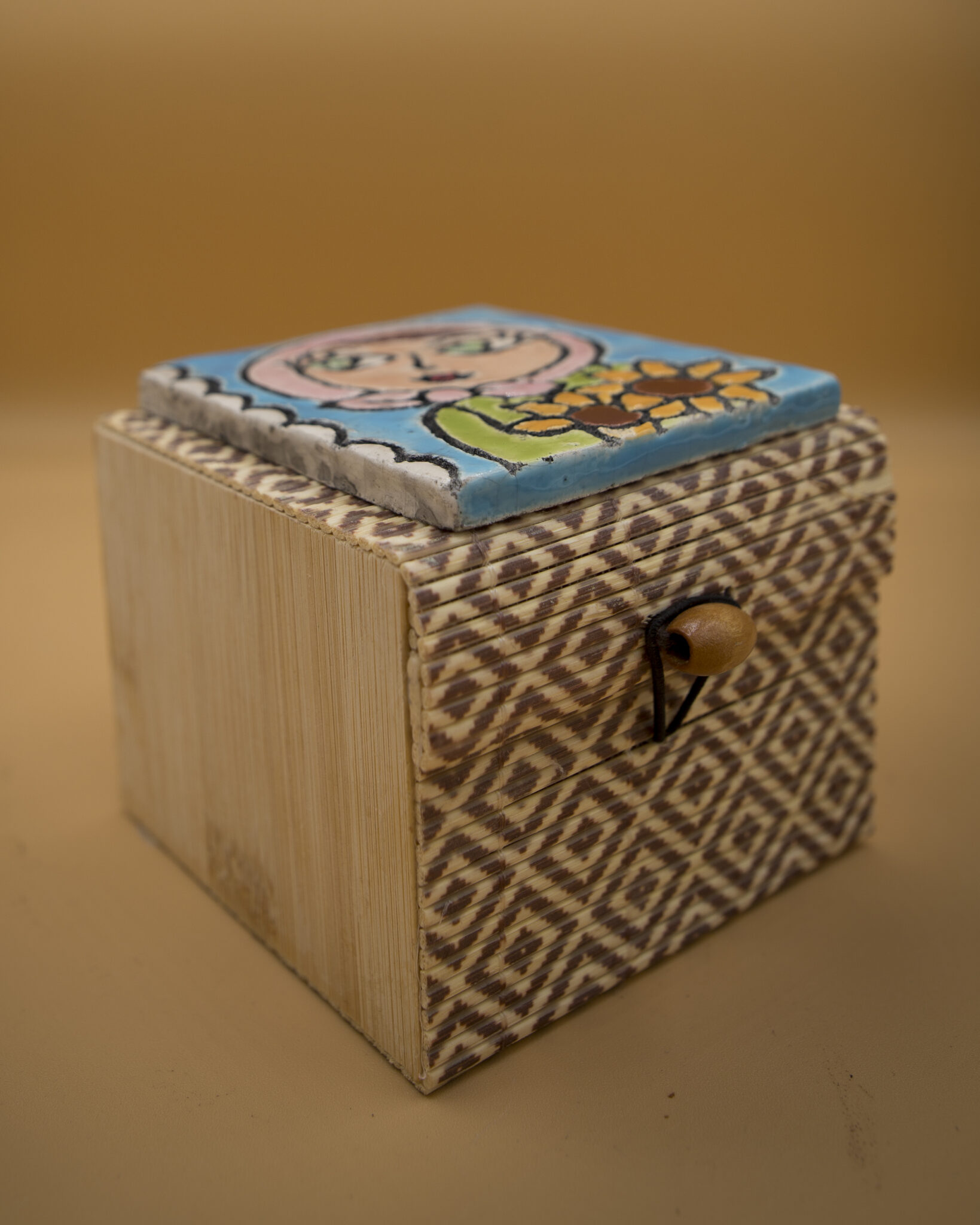 Questa volta la nostra contadinella marchigiana è rappresentata su di una formella in ceramica raku applicata ad una scatola in legno dal sapore orientale.