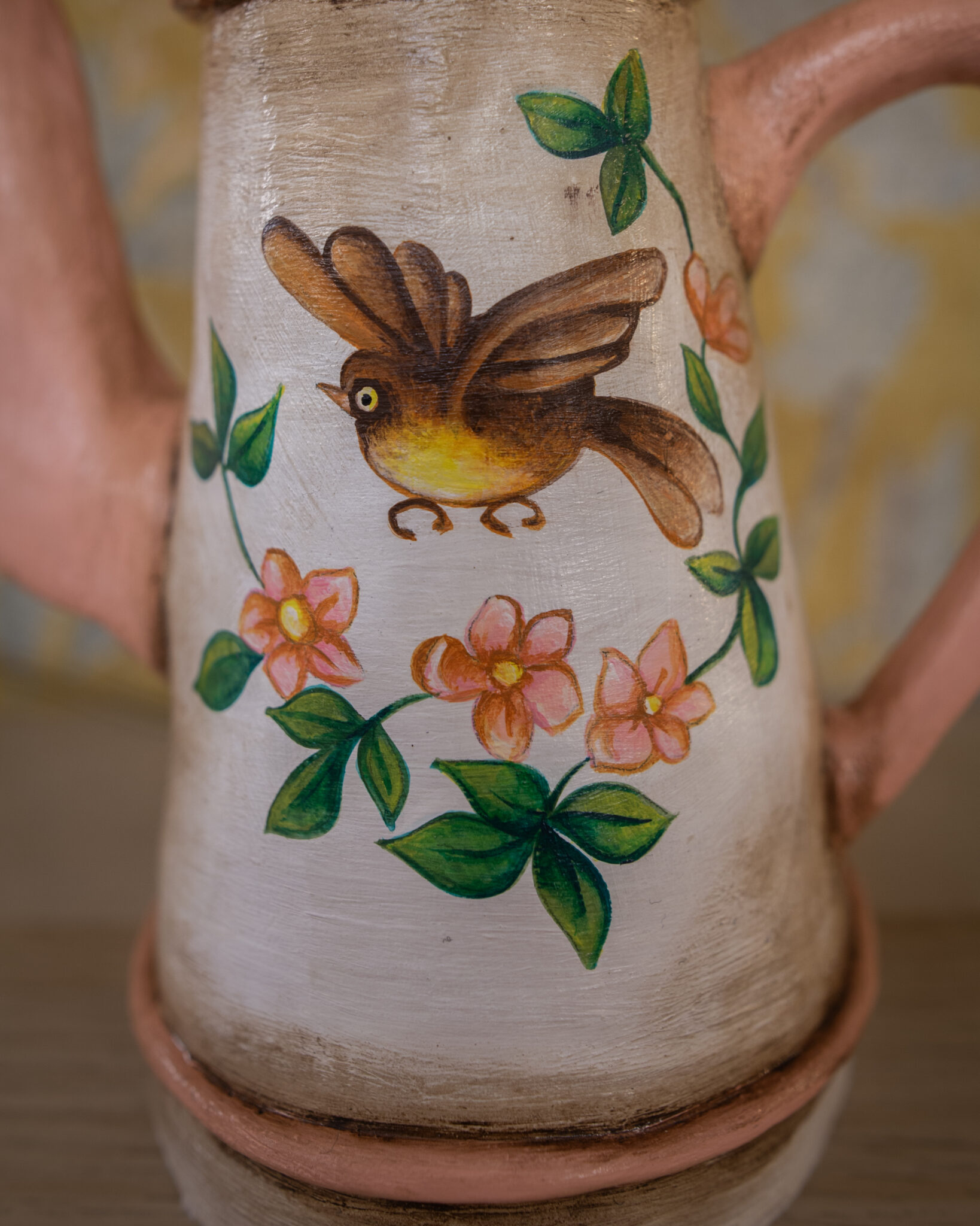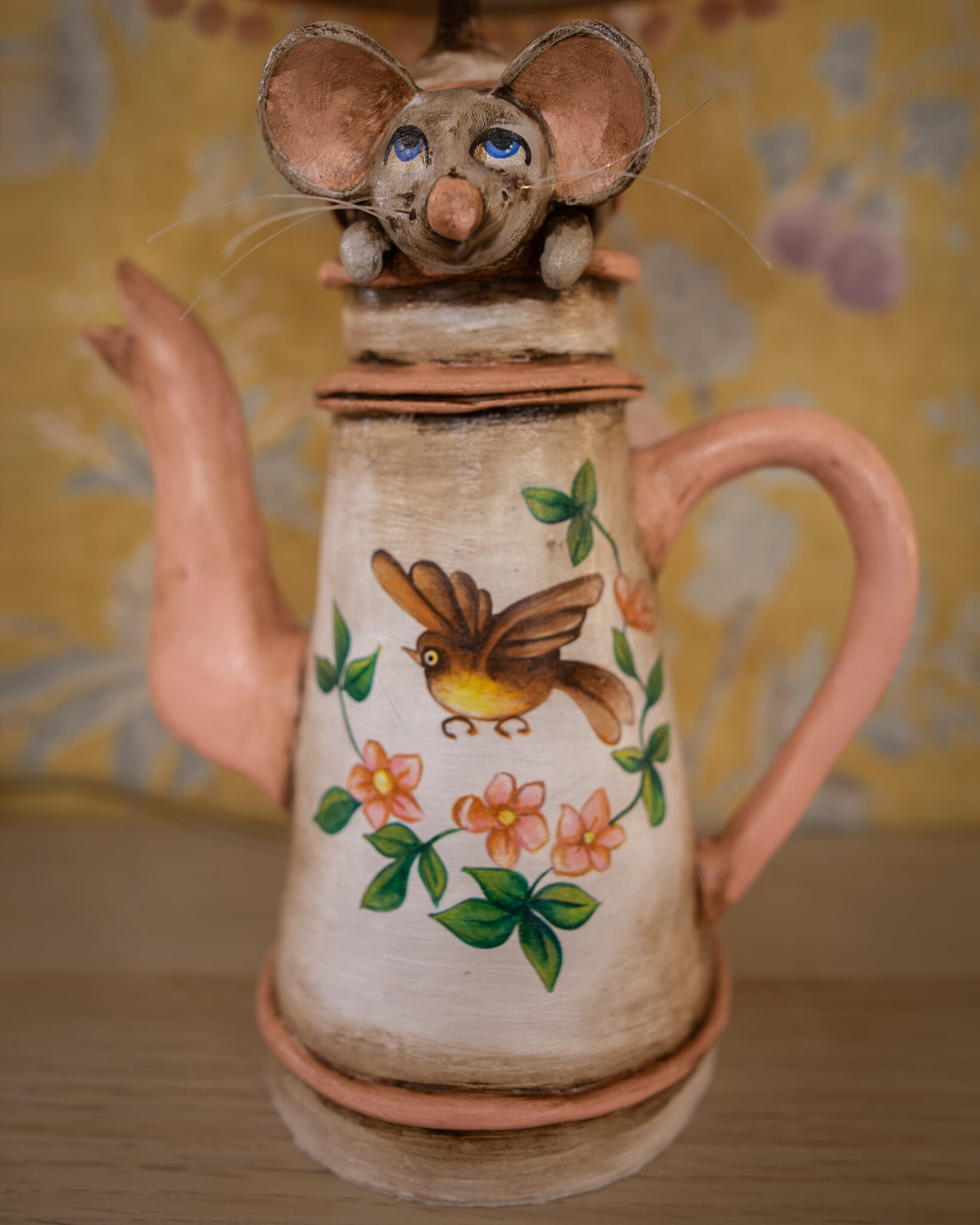 E’ una caffettiera alta e stretta, questa nei toni del rosa e con l’uccellino che la decora.