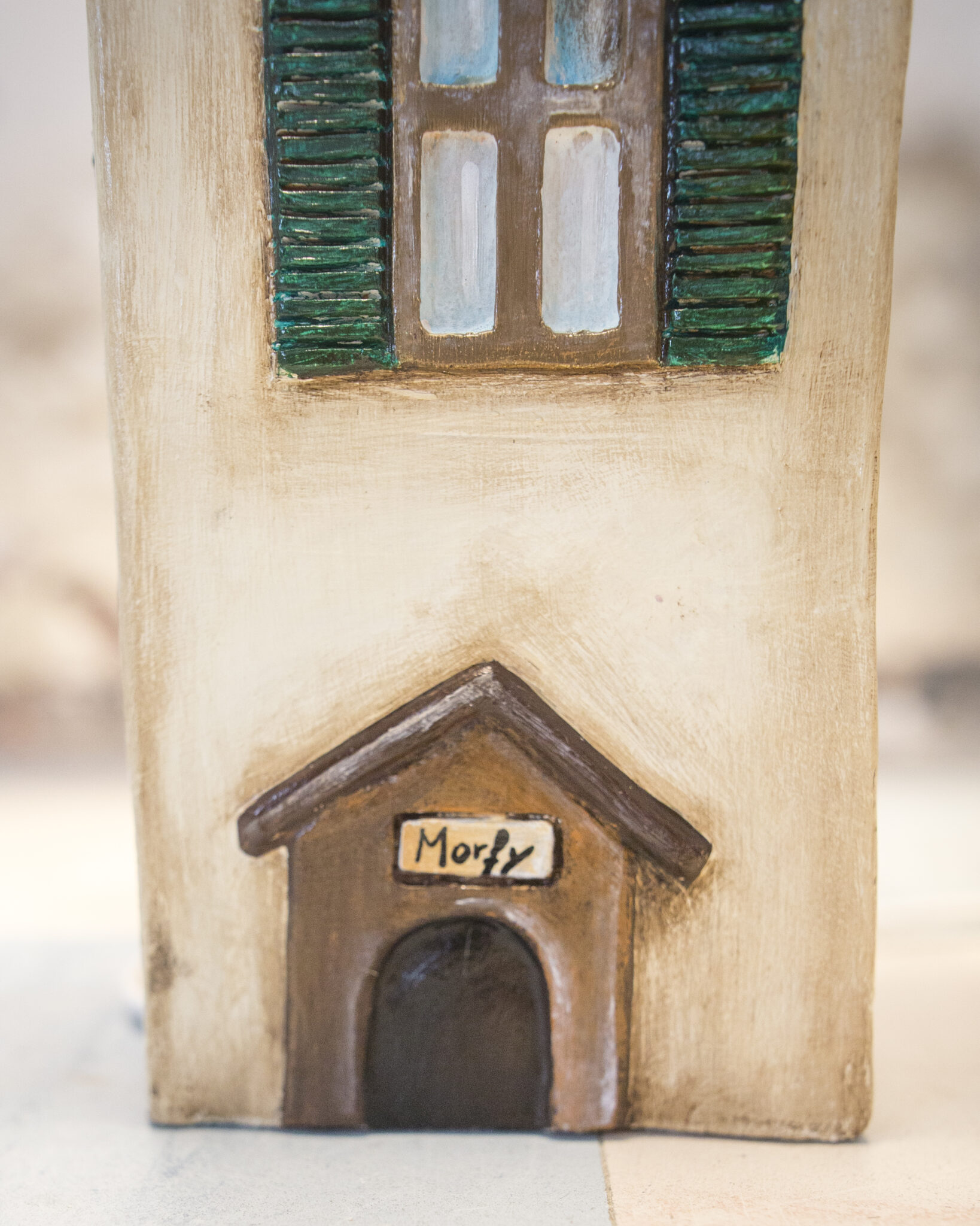 Sul lato della casa, è presente come caratteristica comune a tutte, la cuccia del cane con scritto sulla targhetta appesa, il nome di chi la abita: Morfy. Diminutivo di Morfina, così si chiama il pastore maremmano dell’artista che le ha realizzate.
