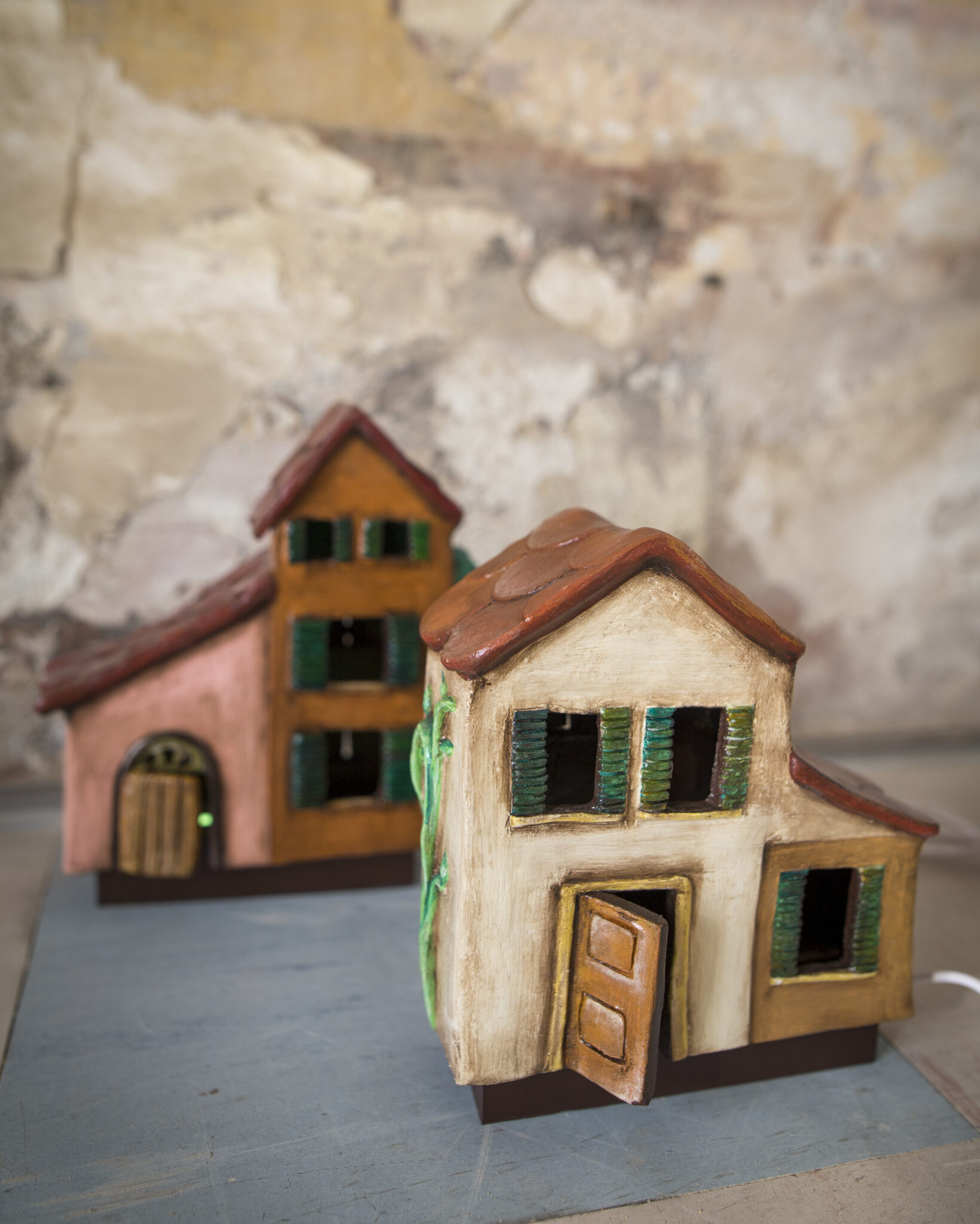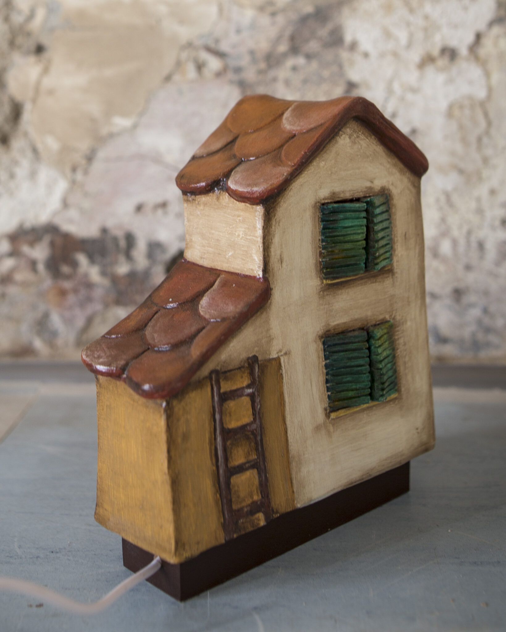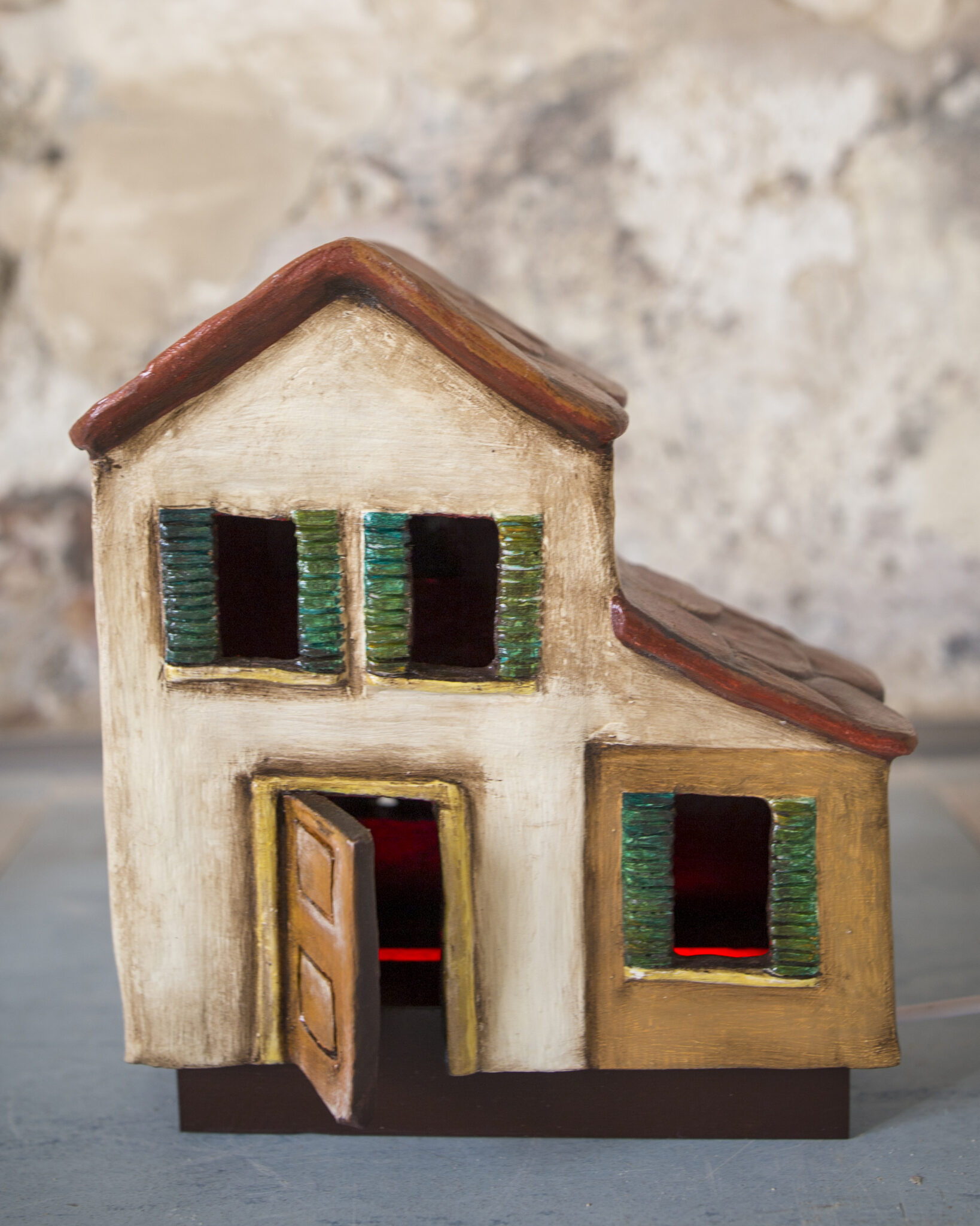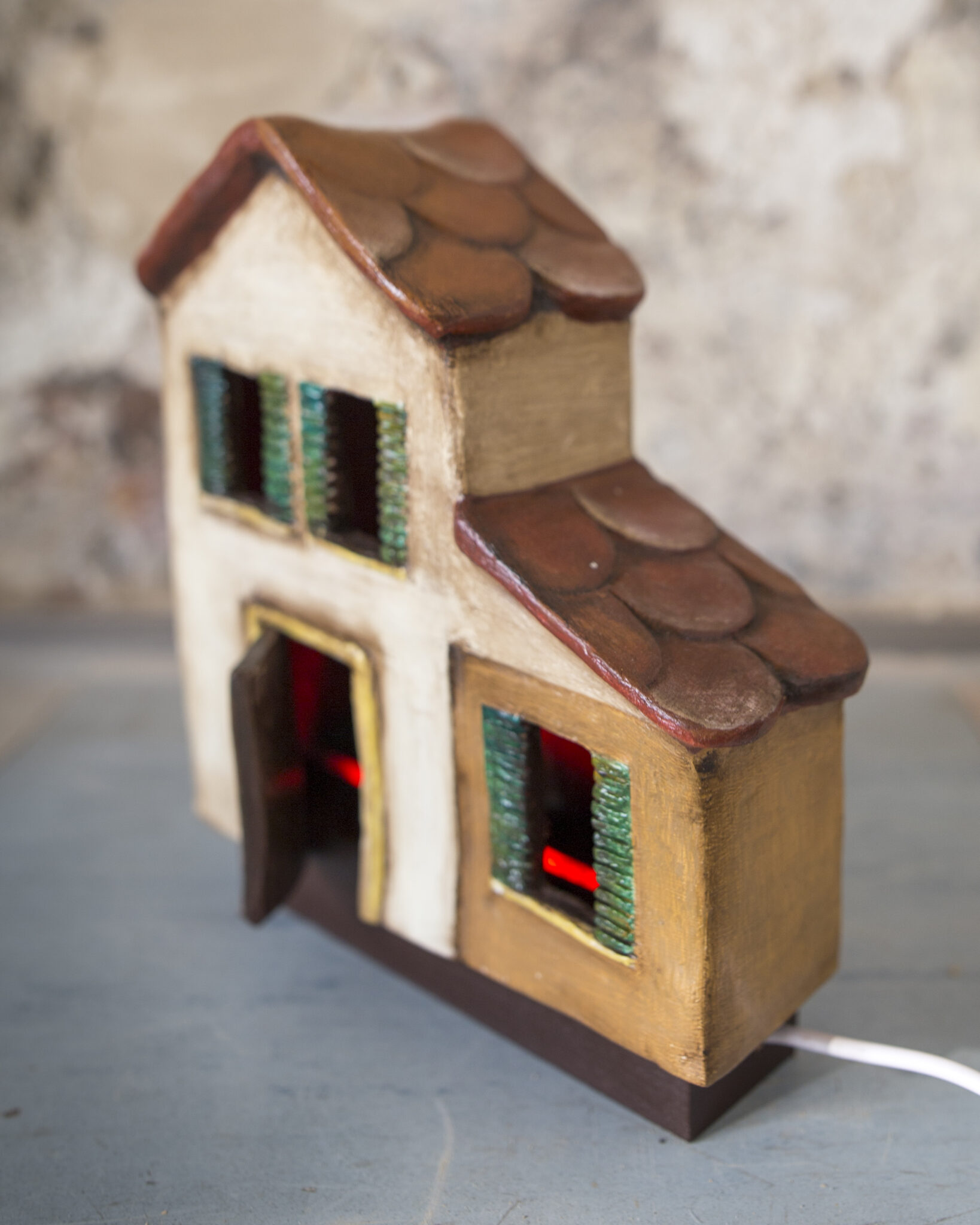 Realizzata a mano in terracotta e senza l’ausilio di stampi, base in legno, ha porte e finestre aperte e traforate, per consentire di far passare la luce dall’interno. Ha una base luminosa di 7 perline LED, 7 colori e luminosità regolabili, è facile da usare.