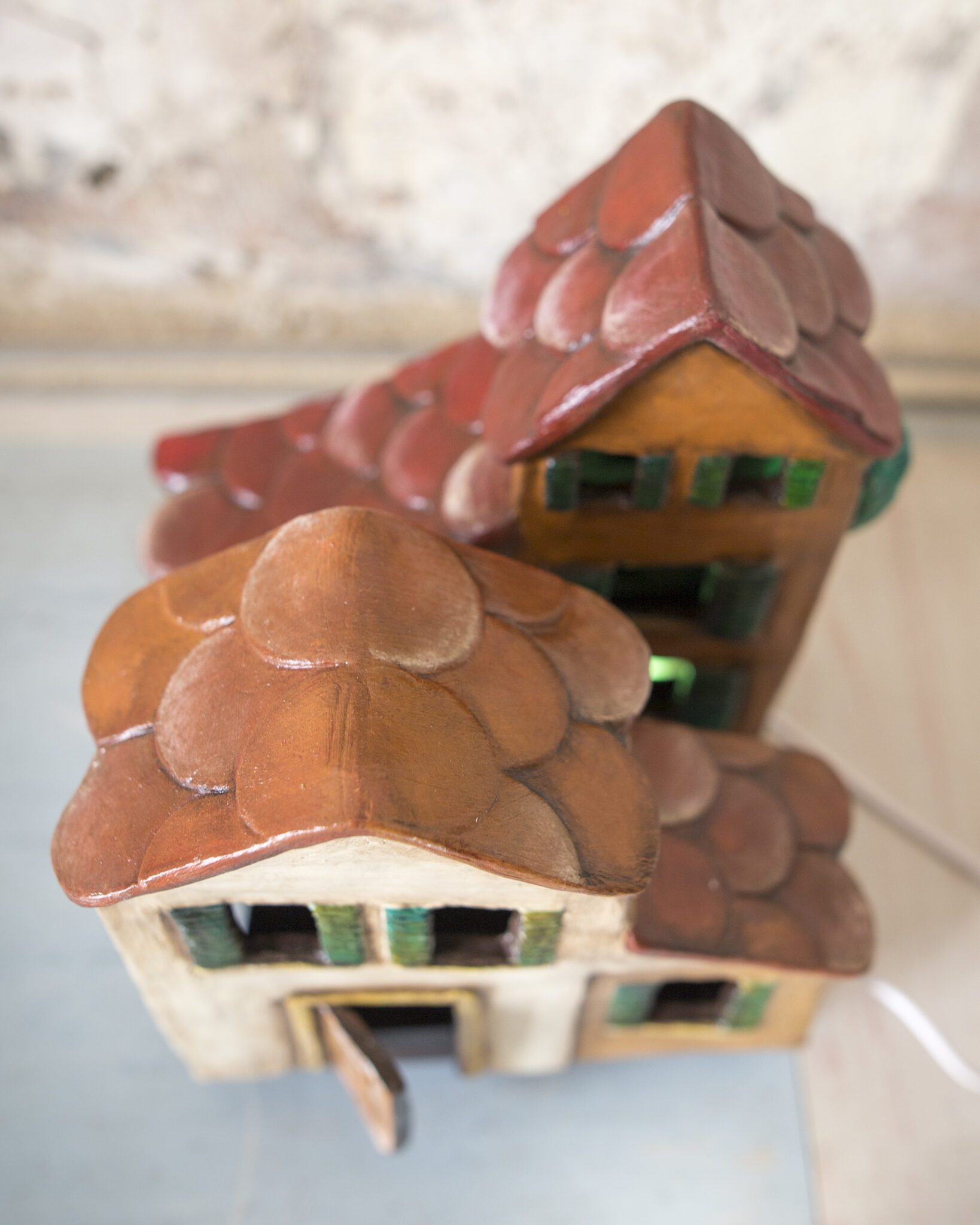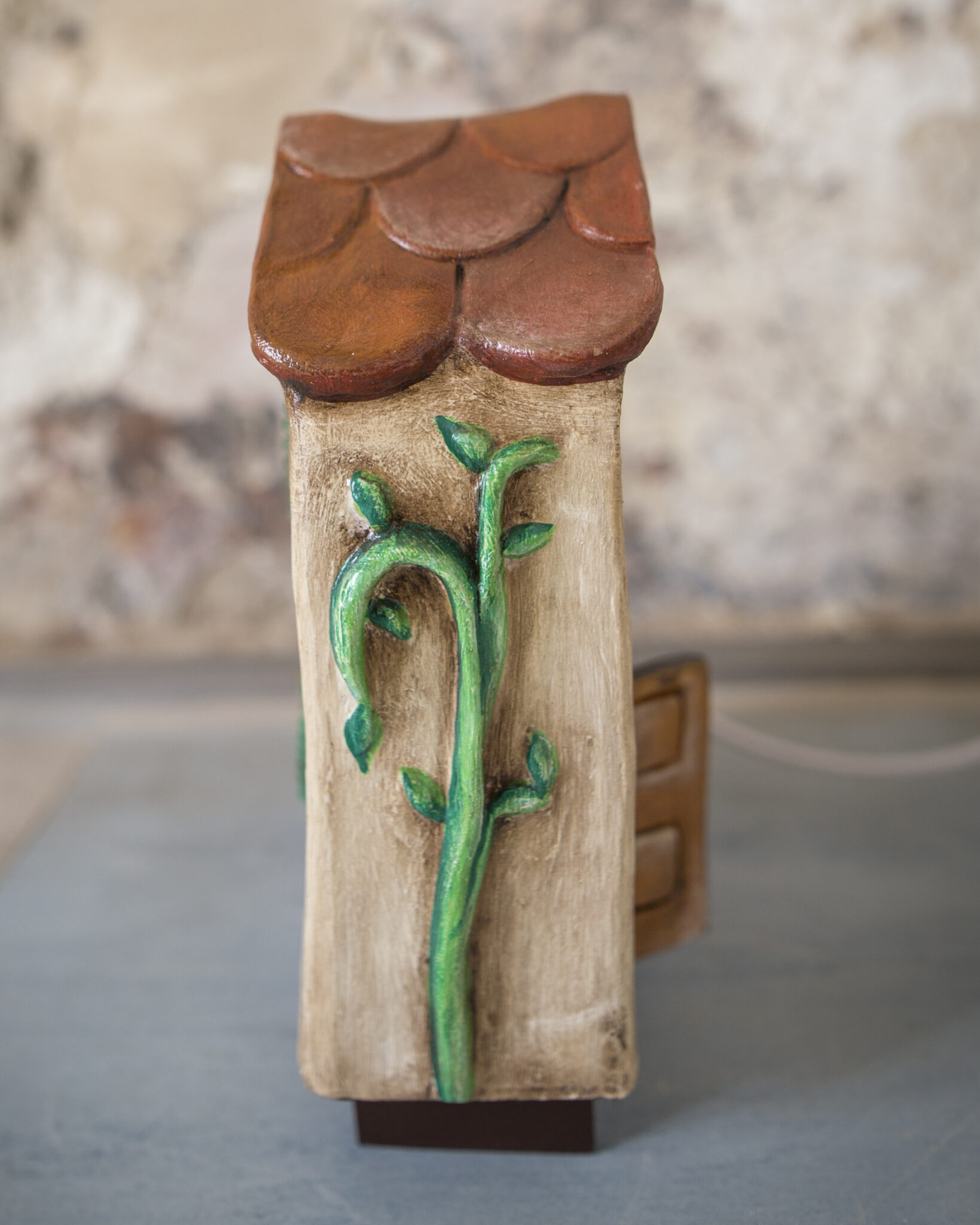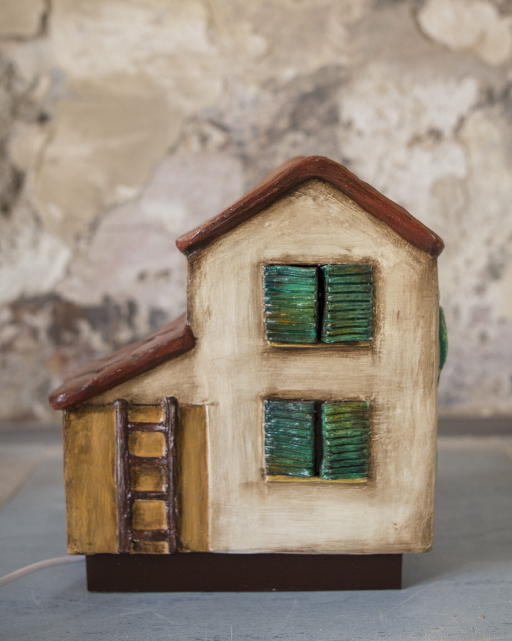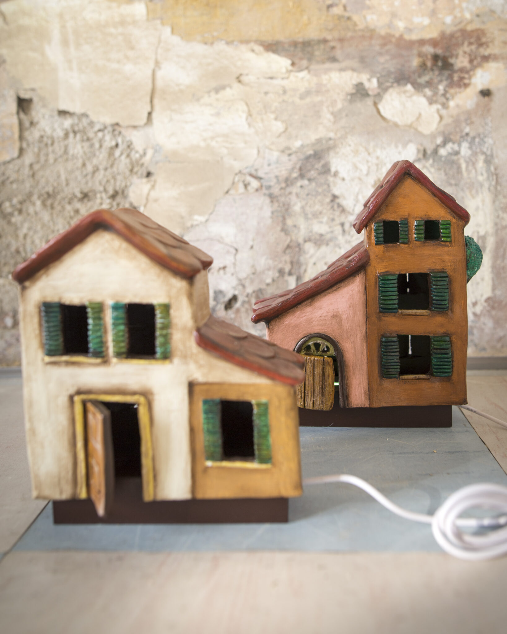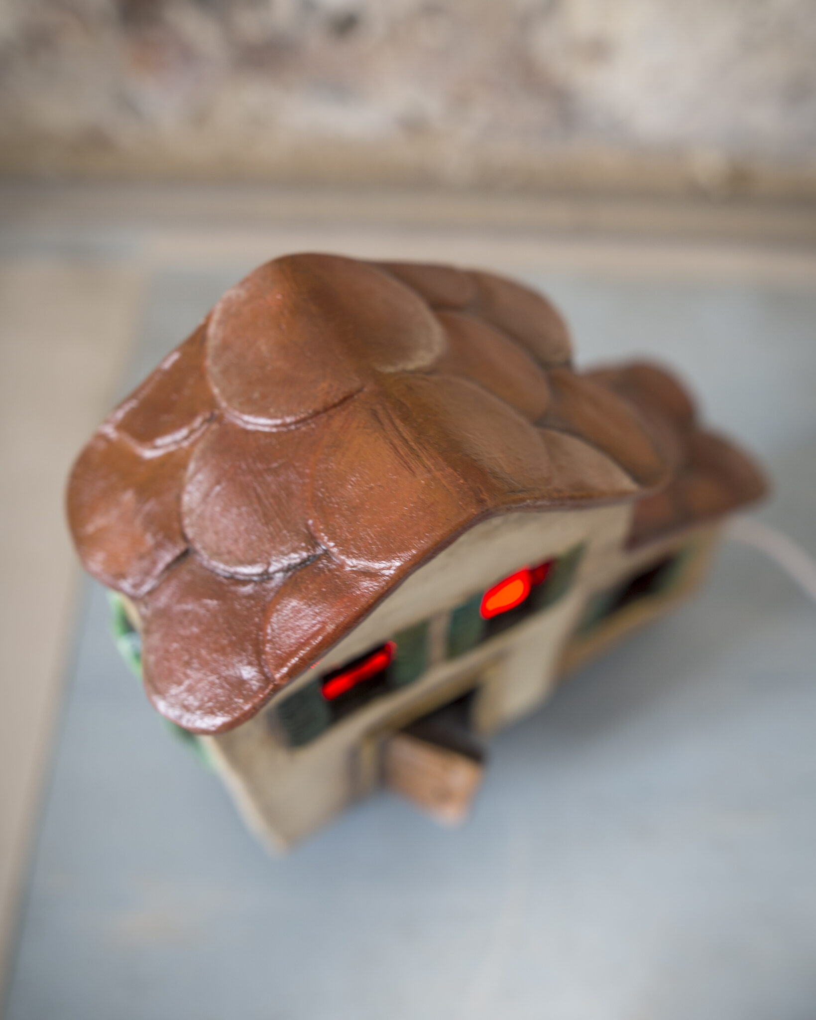Realizzata a mano in terracotta e senza l’ausilio di stampi, base in legno, ha porte e finestre aperte e traforate, per consentire di far passare la luce dall’interno. Ha una base luminosa di 7 perline LED, 7 colori e luminosità regolabili, è facile da usare.