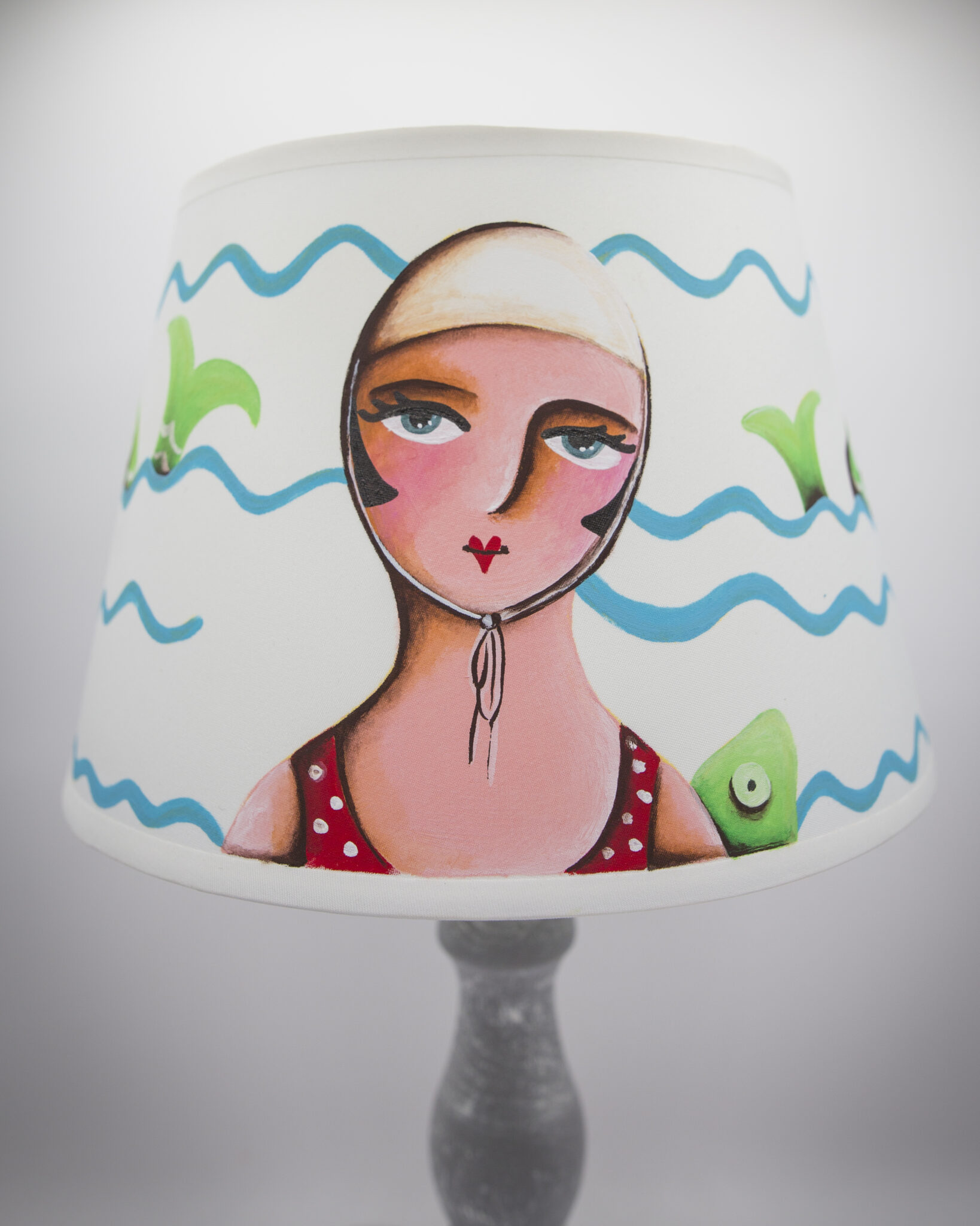 Il basamento in legno decappato dona un aspetto rustico e naturale, mentre il paralume in cotone bianco decorato a mano raffigura dettagli di bagnante con cuffietta e costumino, pesci e onde, creando un’atmosfera suggestiva e rilassante.