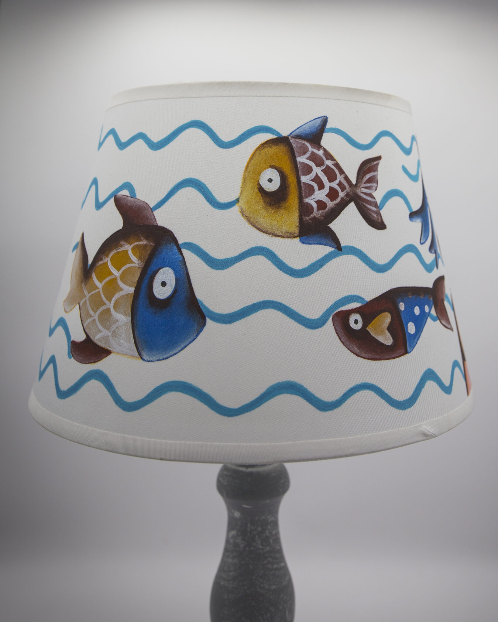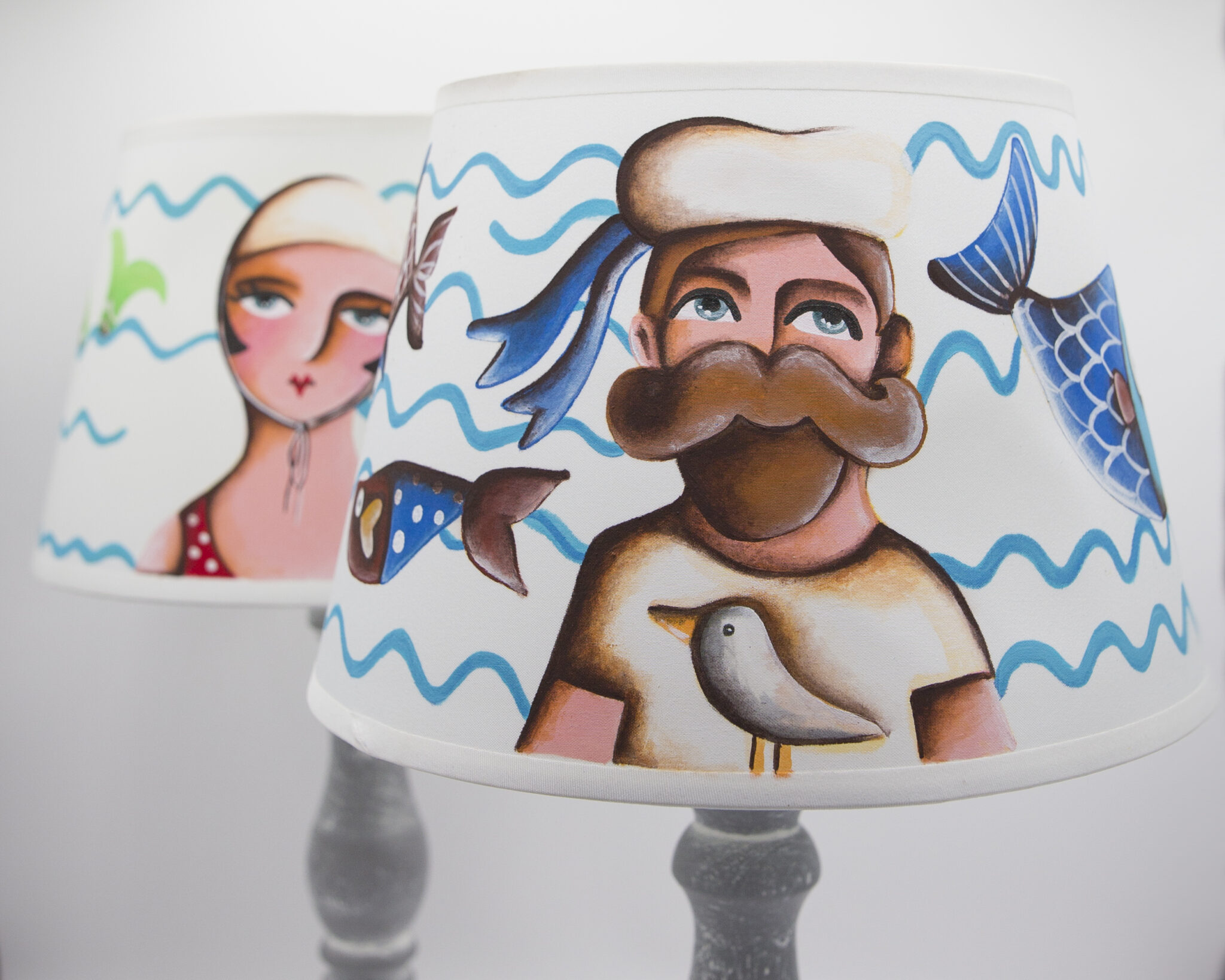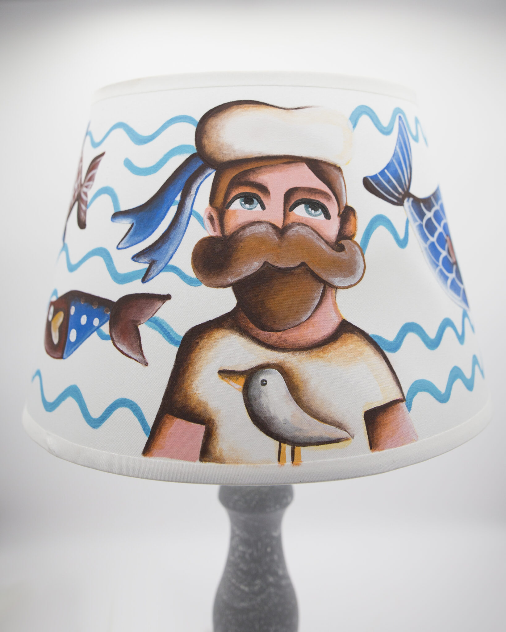 Il basamento in legno decappato dona un aspetto rustico e naturale, mentre il paralume in cotone bianco decorato a mano raffigura dettagli di marinaio, pesci e onde, creando un’atmosfera suggestiva e rilassante.